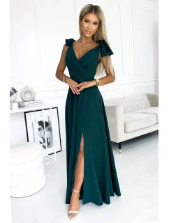 Pěkně vytvarovaný výstřih a vysoký rozparek ve spodní části šatů vytváří neobyčejnou kreaci v lahvově zelené barvě. Tyto šaty značky Numoco jsou polským výrobkem.