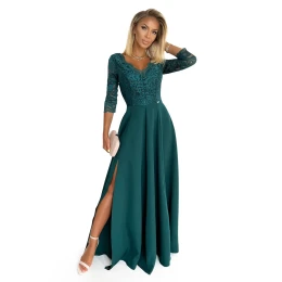 AMBER Elegantní dlouhé dámské krajkové šaty v lahvově zelené barvě s výstřihem model 17691306 - numoco