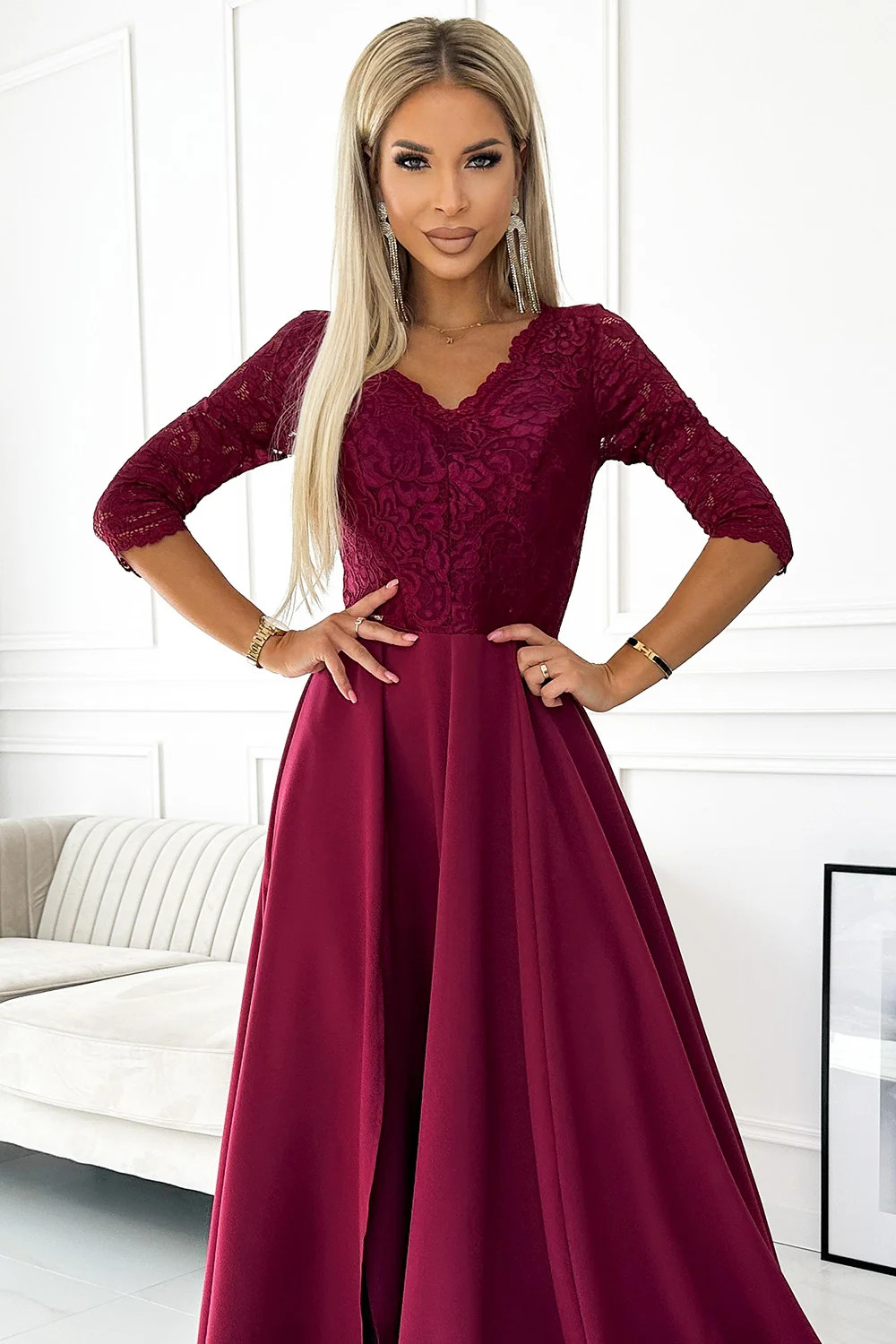 AMBER - Elegantní dlouhé dámské maxi šaty ve vínové bordó barvě s krajkovým výstřihem 309-9