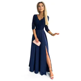AMBER Tmavě modré elegantní dámské dlouhé krajkové šaty s výstřihem model 18012873 - numoco