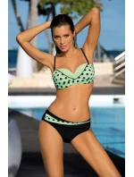 Plavky mají sexy a velmi pohodlnou podprsenku typu bardotka. Horizontální linie střihu umožňuje dosáhnout smyslného vzhledu a maximální elegance. Košíčky jsou vyztužené, obohacené o podvazky (horizontální a vertikální), doplněné kapsičkami na přiložené push-up košíčky (k dispozici ve velikostech S, M, L, XL) - umístěte je do podprsenky a vaše prsa se opticky zvětší o více než jednu velikost. Konstrukce také umožňuje dokonalé zvednutí prsou a jejich přiblížení k sobě. Zadní část podprsenky se zapíná na přezku. Ramínka mají nastavitelnou délku a lze je zcela odepnout (můžete je odepnout na opalování).