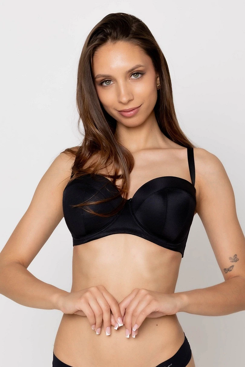 Podprsenka Angel 19231 Black od značky Mediolano je ideální pro ženy, které ocení jemnou eleganci a pohodlí v každé situaci. Hladký bardotkový model s push-up, odnímatelnými ramínky a silikonovou páskou na lemu poskytuje ideální oporu i bez přídavné výztuže. Push-up košíček nabízí možnost vyjmutí vložky z kapsy všité z vnitřní strany. Je ideální pro večerní šaty, topy bez ramínek a další náročné styly. Košíčky krásně modelují poprsí a tělová barva splývá s pokožkou, takže zůstává pod oblečením neviditelná.