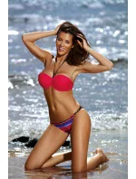Podprsenka vychází ze střihu sexy bardotky, s vyztuženými košíčky a velkým push-up efektem okamžitě sbírá, zvedá a opticky zvětšuje ňadra, takže dekolt je obzvlášť atraktivní. Elastický obvod, pohodlně zavazující se na zádech. U krku módní ozdobný pásek s bižuterií, který lze v případě potřeby z modelu zcela odepnout a rovnoměrně tak opálit tělo. Hladká látka podprsenky se skvěle hodí ke vzorovaným, barevným kalhotkám na tenkých "elastických" ramínkách, na bocích. Jejich střih svádí sexy linií, která krásně zvýrazňuje boky a nohy vypadají delší, než ve skutečnosti jsou... Sexy! Střih je díky elastickým ramínkům na bocích velmi pružný.