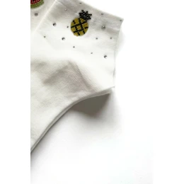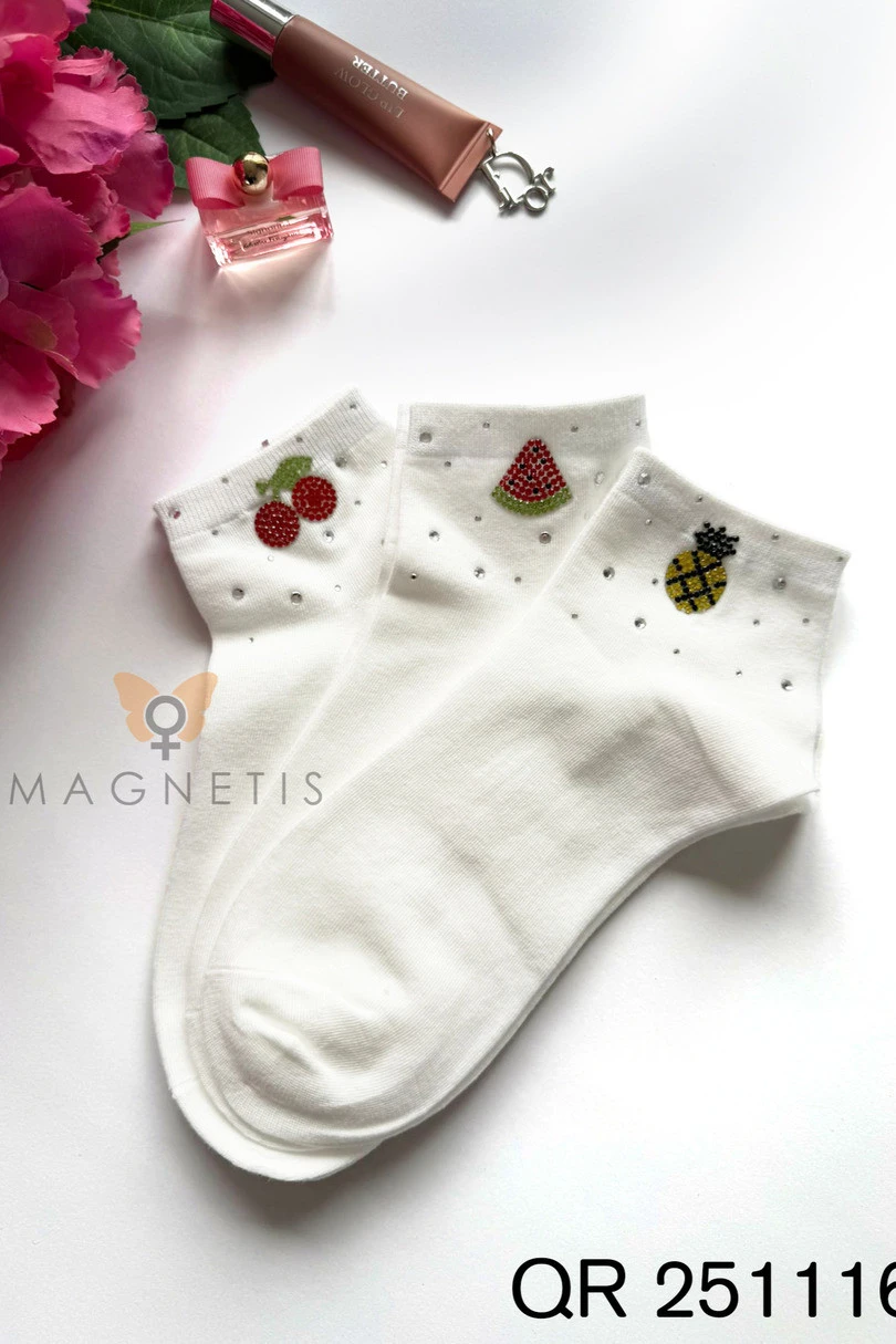 Skarpetki damskie Magnetis QR251116 02 z aplikacją to modny i kobiecy dodatek, który doskonale uzupełni codzienne stylizacje. Klasyczny biały kolor został ozdobiony efektowną aplikacją w kształcie ananasa oraz subtelnymi, dekoracyjnymi kryształkami, które nadają całości wyjątkowego charakteru. To idealne skarpetki wzorzyste dla kobiet, które cenią modne detale i stylowe akcenty. Wysoka zawartość bawełny (92%) zapewnia miękkość, przewiewność i komfort noszenia przez cały dzień. Dodatek elastanu (8%) gwarantuje elastyczność oraz idealne dopasowanie do stopy, dzięki czemu skarpetki nie zsuwają się i zachowują swój kształt nawet po wielokrotnym praniu. Materiał jest przyjemny dla skóry oraz odporny na deformacje. Model QR251116 02 świetnie sprawdzi się w stylizacjach casualowych, sportowych oraz w modnych zestawach z nutą elegancji. Doskonale komponuje się ze sneakersami, trampkami, balerinami czy loafersami. Skarpetki z aplikacją Magnetis łączą wygodę, jakość i modn