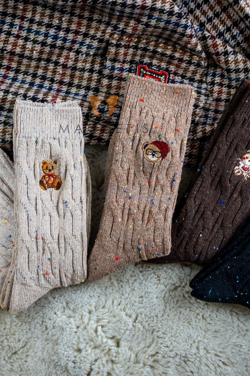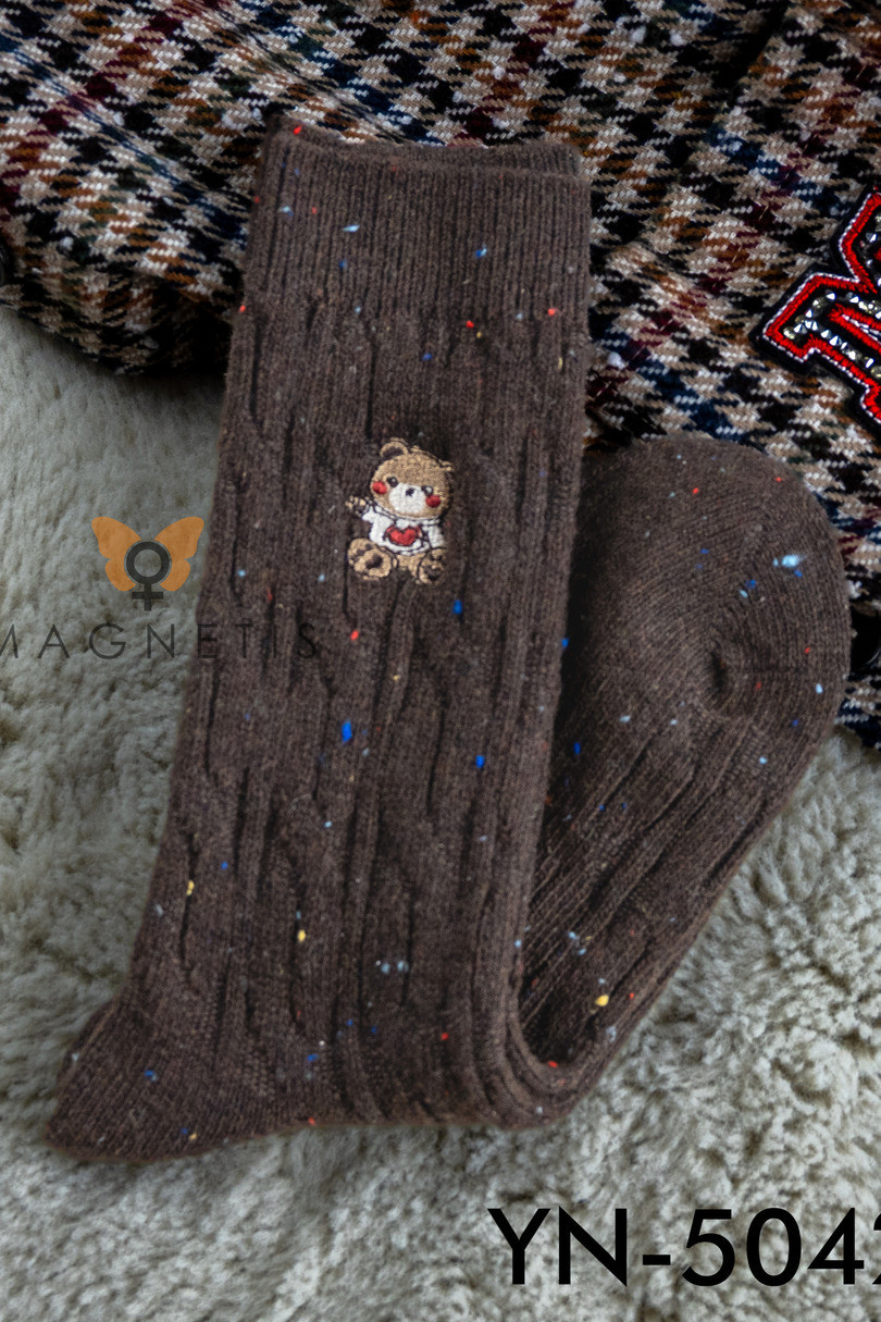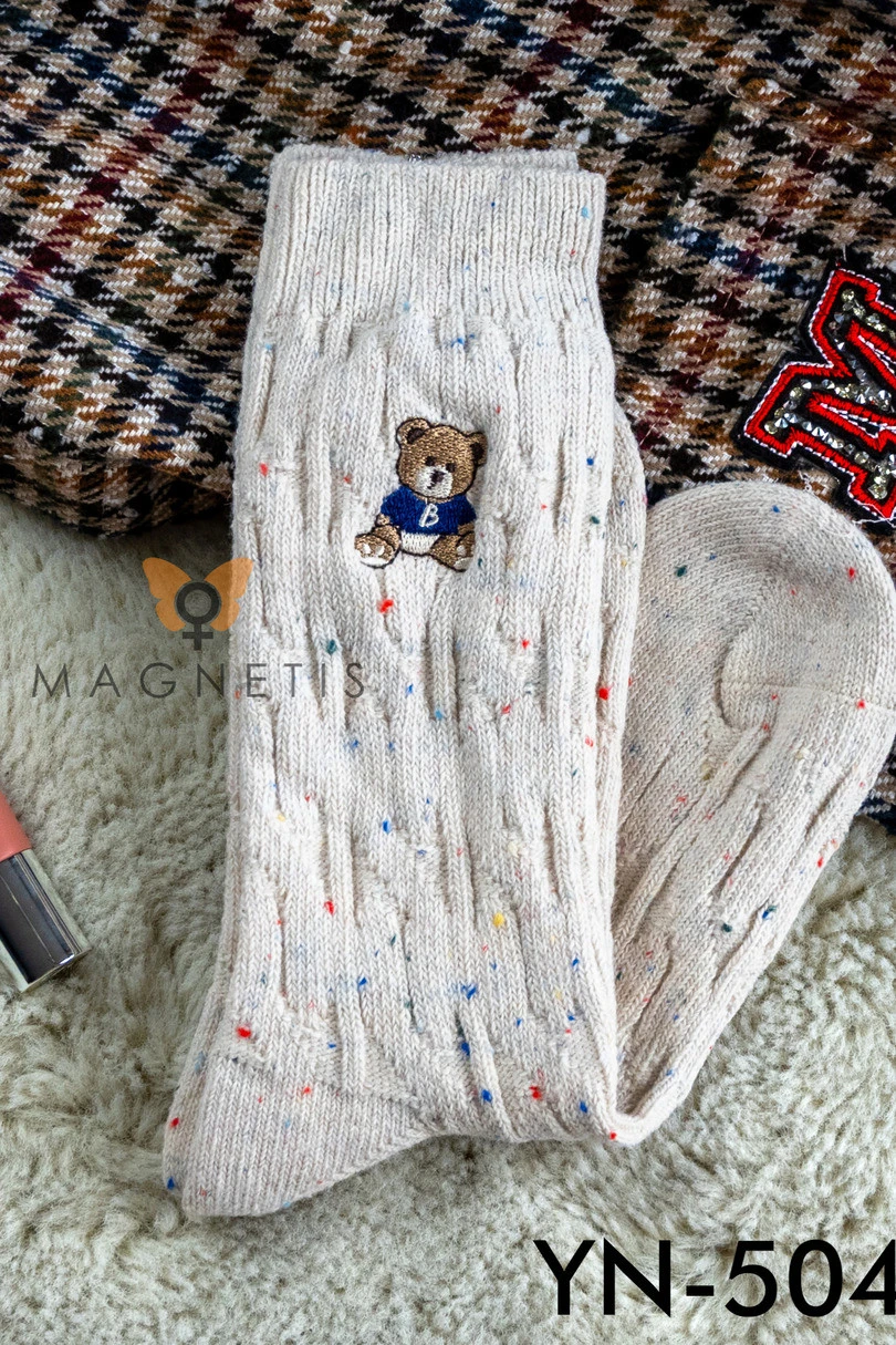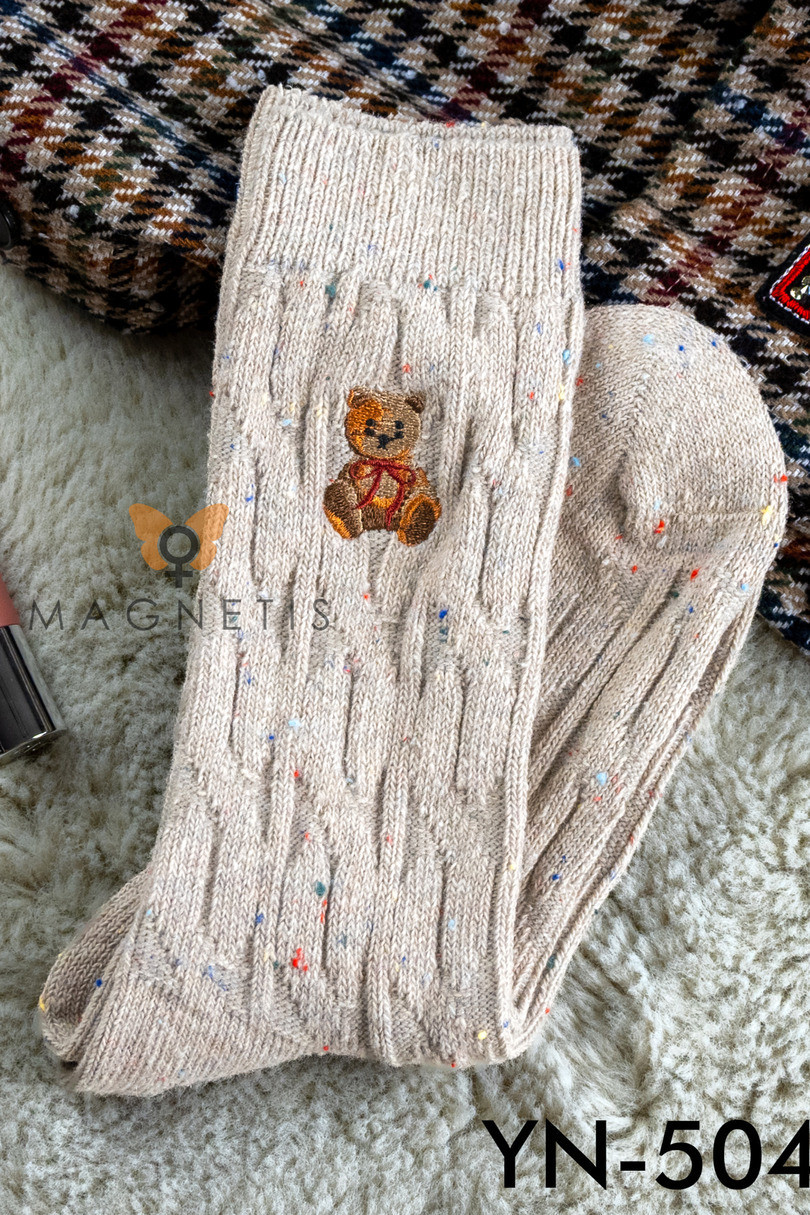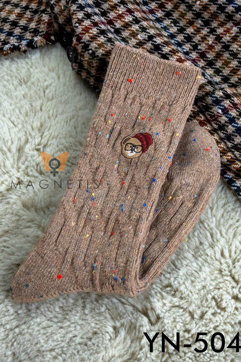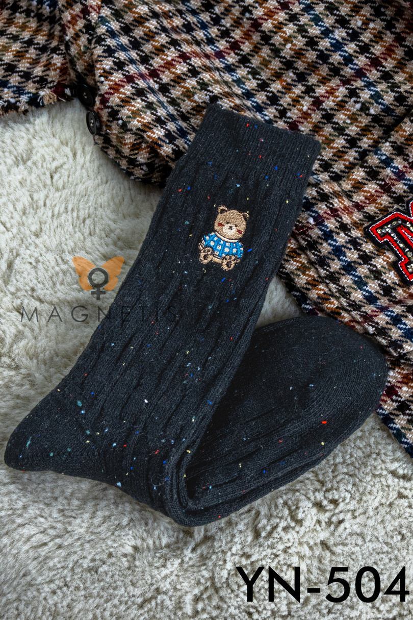 Skarpetki YN-5042 od Magnetis to uroczy i ciepły dodatek do jesienno-zimowej garderoby. Wykonane z miękkiej dzianiny z wysoką zawartością bawełny, wełny i wiskozy, zapewniają komfort termiczny i przyjemne uczucie otulenia.Charakterystyczny splot typu warkocz w połączeniu z kolorowymi drobinkami przędzy nadaje całości efekt „confetti”, a haftowana aplikacja misia w różnych stylizacjach dodaje skarpetkom zabawnego, zimowego uroku. Idealne do noszenia na co dzień w domu, do botków, a nawet jako oryginalny prezent.