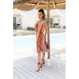 Vzdušné květinové šaty s tenkými nastavitelnými ramínky. Překrývající se výstřih zvýrazněný jemným volánkem. Zavazování v pase. Šaty jsou podšité a mají krásný, vzdušný a velmi ženský styl ideální na léto. Měkká tkanina. Složení: 95% polyester, 5% elastan.