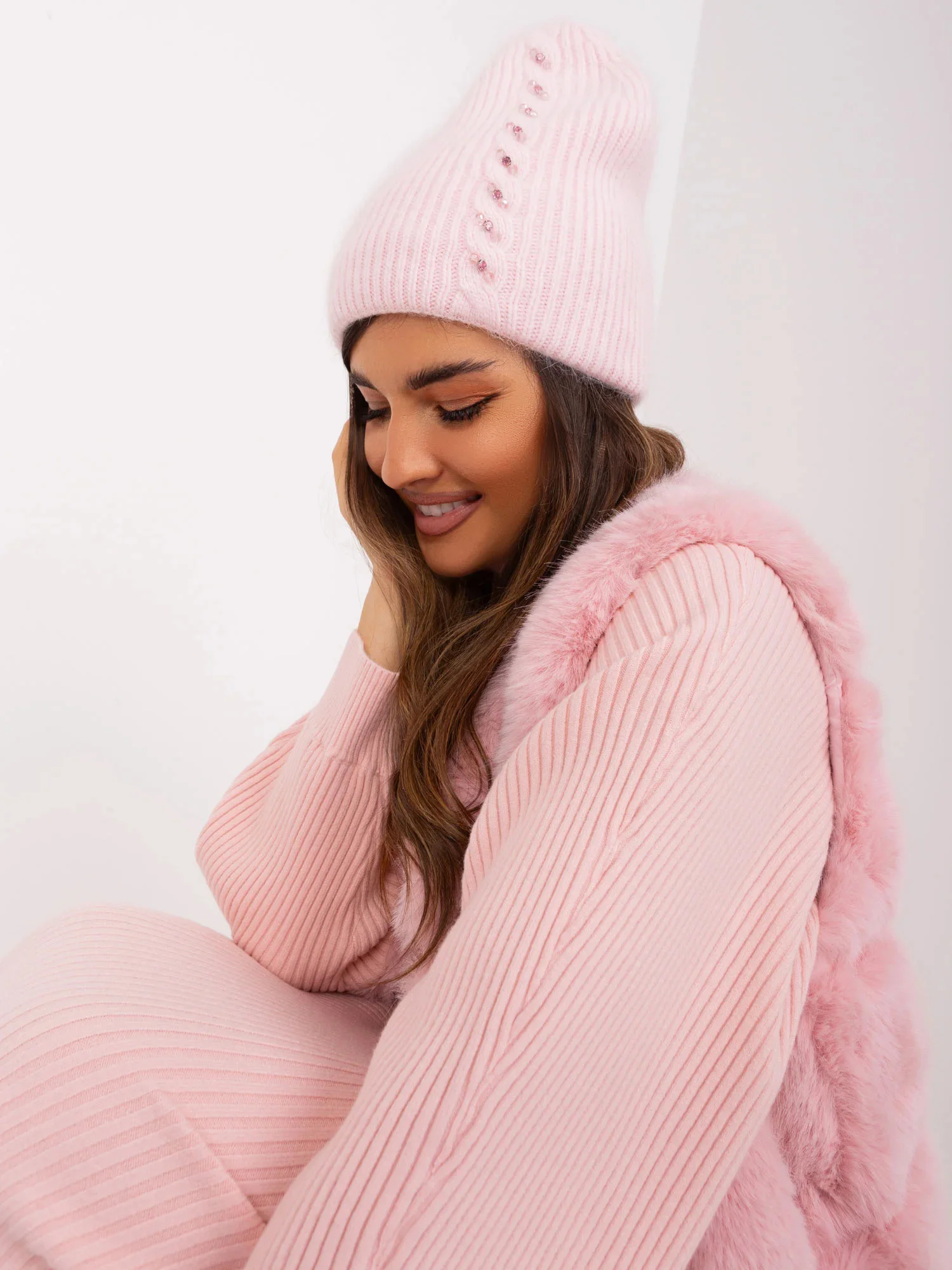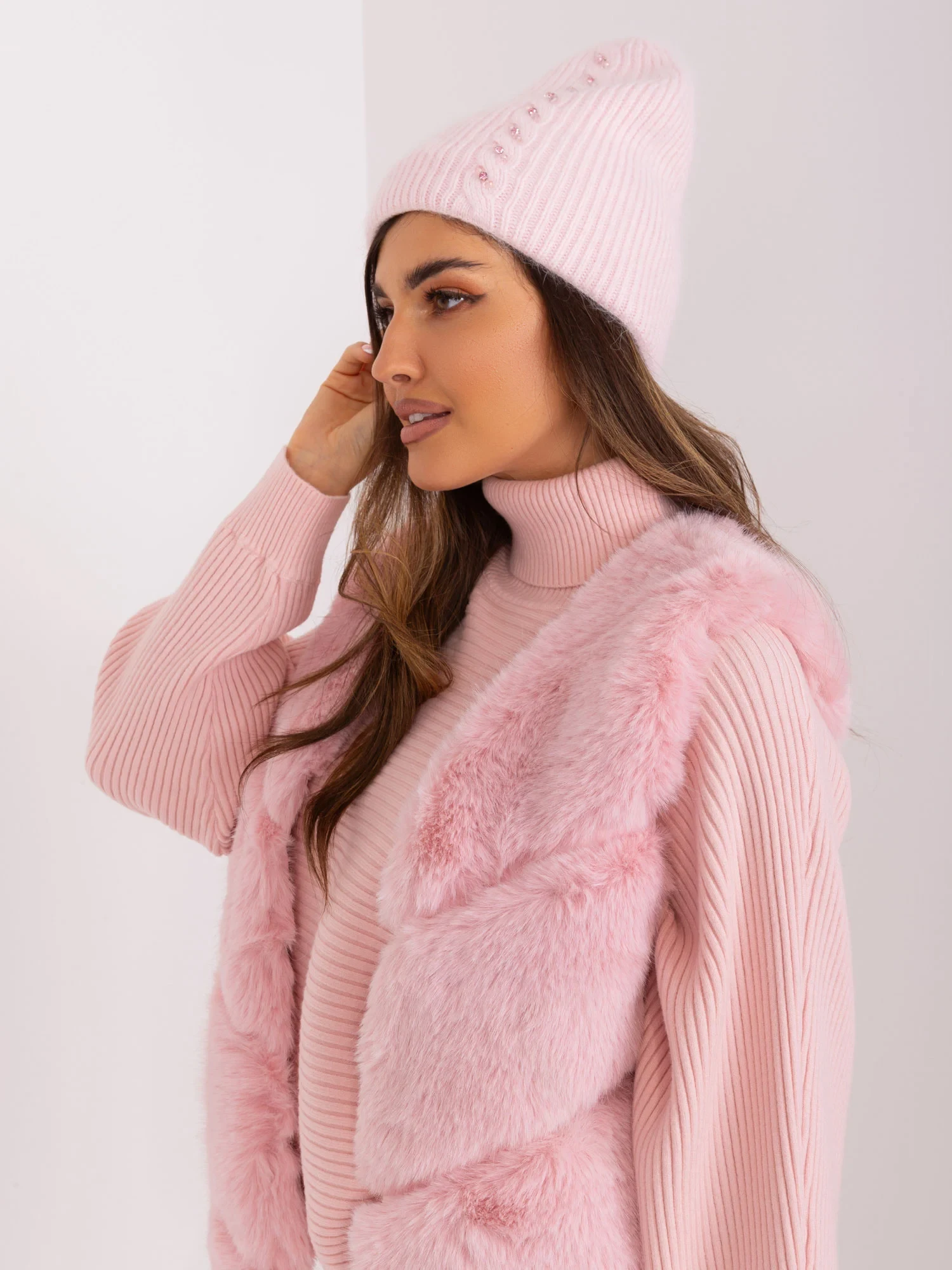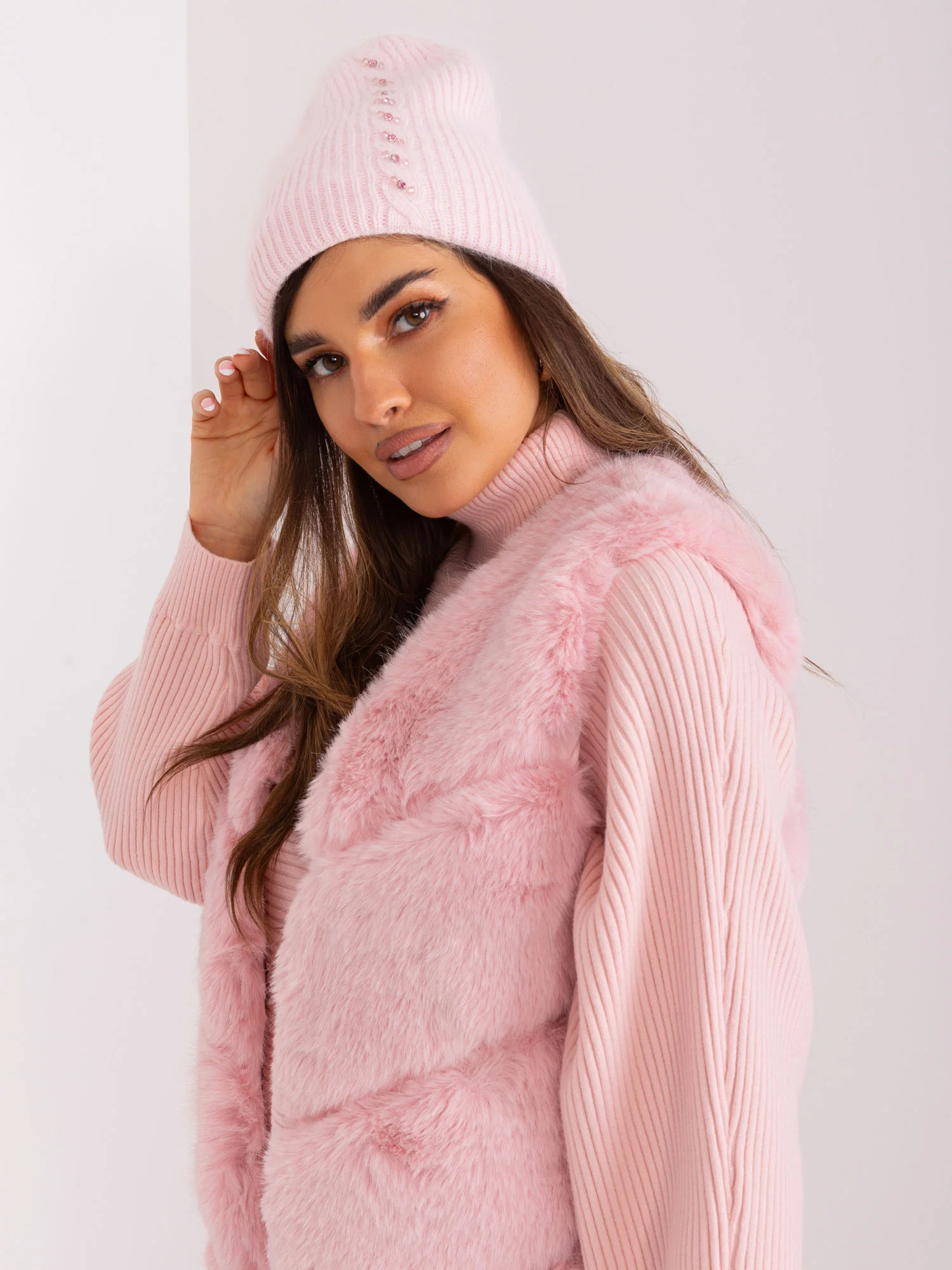 Světle růžová dámská zimní čepice.