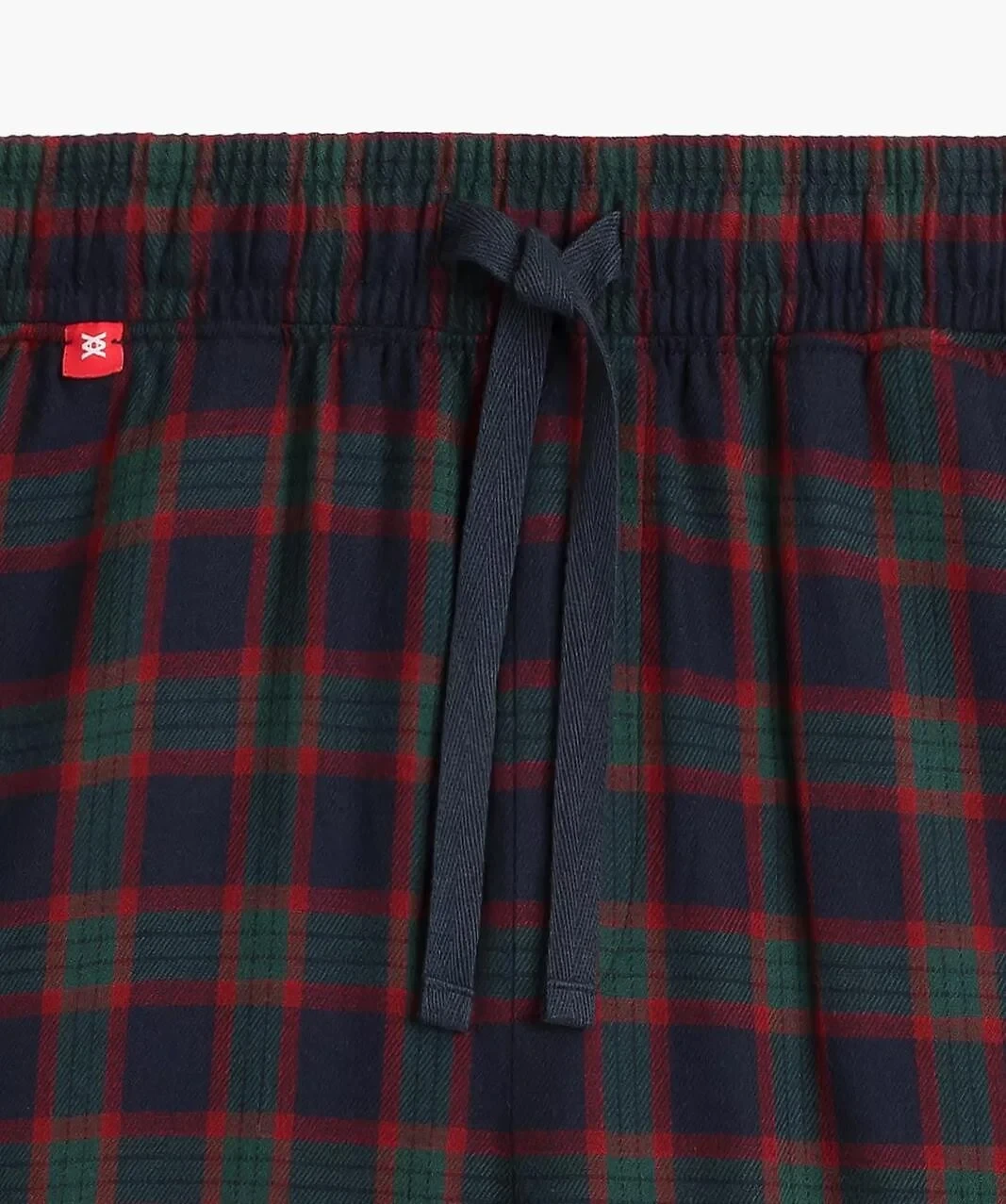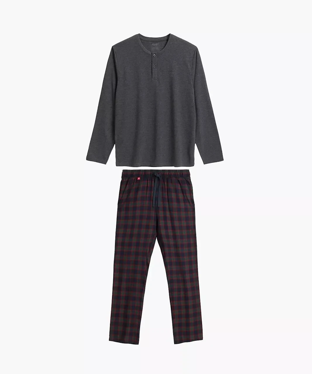 barva: šedočervená halenka 65 % polyester, 35 % bavlna; kalhoty 100 % bavlna