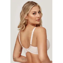 Biustonosz marki Azal. Model Anita. Posiada druty, które podpierają piersi odpowiednio je kształtując. Fiszbiny pionowe osadzone na bokach. Produkt posiada regulowane ramiączka bez możliwości ich odpięcia. Haczyki do ramiączek metalowe. Biustonosz zapinany na haftki. Miejsce zapięcia: tył. Dwa rzędy haftek pionowych. Trzy stopnie haftek poziomych. Produkt został wykonany z 88% poliamid, 8% bawełna, 4% elastan. Produkt damski.