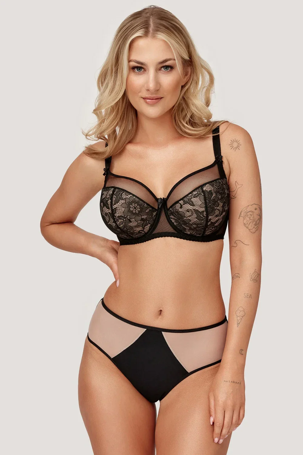 Biustonosz marki Azal. Model Anita. Posiada druty, które podpierają piersi odpowiednio je kształtując. Fiszbiny pionowe osadzone na bokach. Produkt posiada regulowane ramiączka bez możliwości ich odpięcia. Haczyki do ramiączek metalowe. Biustonosz zapinany na haftki. Miejsce zapięcia: tył. Dwa rzędy haftek pionowych. Trzy stopnie haftek poziomych. Produkt został wykonany z 88% poliamid, 8% bawełna, 4% elastan. Produkt damski.