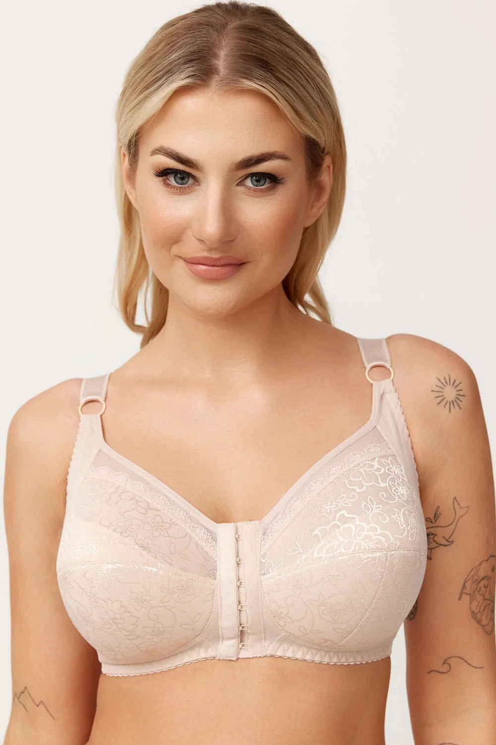 Biustonosz marki Azal. Model P025 MAXI. Produkt posiada regulowane ramiączka bez możliwości ich odpięcia. Haczyki do ramiączek metalowe. Biustonosz zapinany na haftki. Miejsce zapięcia: przód. Produkt został wykonany z 88% poliamid, 8% bawełna, 4% elastan. Produkt damski.