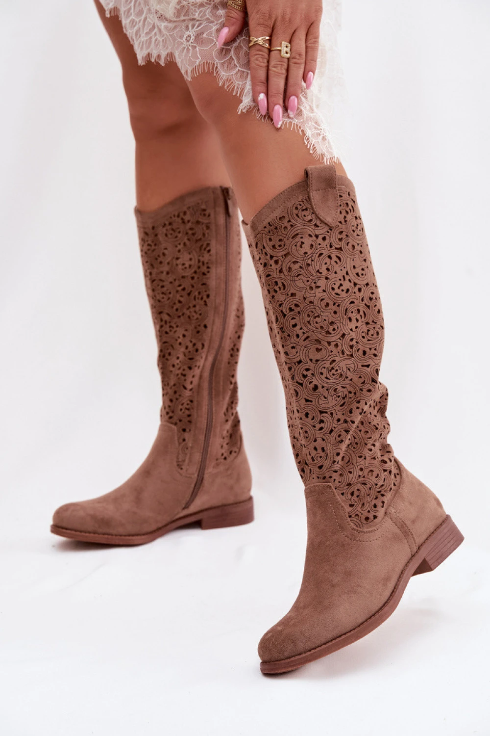 Ažurové dámské kozačky v boho stylu jsou jedinečnou nabídkou pro ženy, které ocení volnost a módní vzhled. Jemné výřezy na lících jim dodávají lehkost a originální charakter, zdůrazňujíce jedinečný styl modelu. Plochý podpatek zajišťuje pohodlí během každodenního nošení a praktický zip usnadňuje rychlé obouvání a svlékání obuvi. Tyto kozačky skvěle ladí s šaty, sukněmi a přiléhavými kalhotami, vytvářejí stylové sestavy inspirované boho atmosférou.