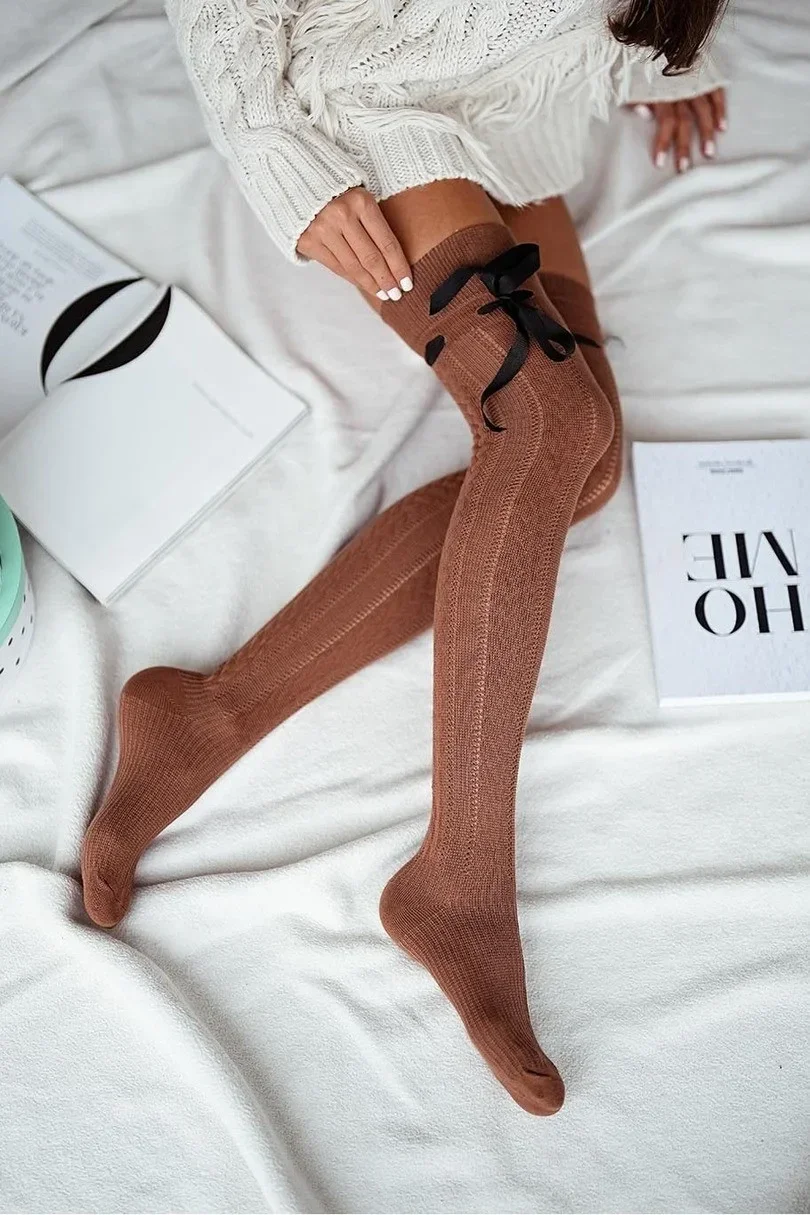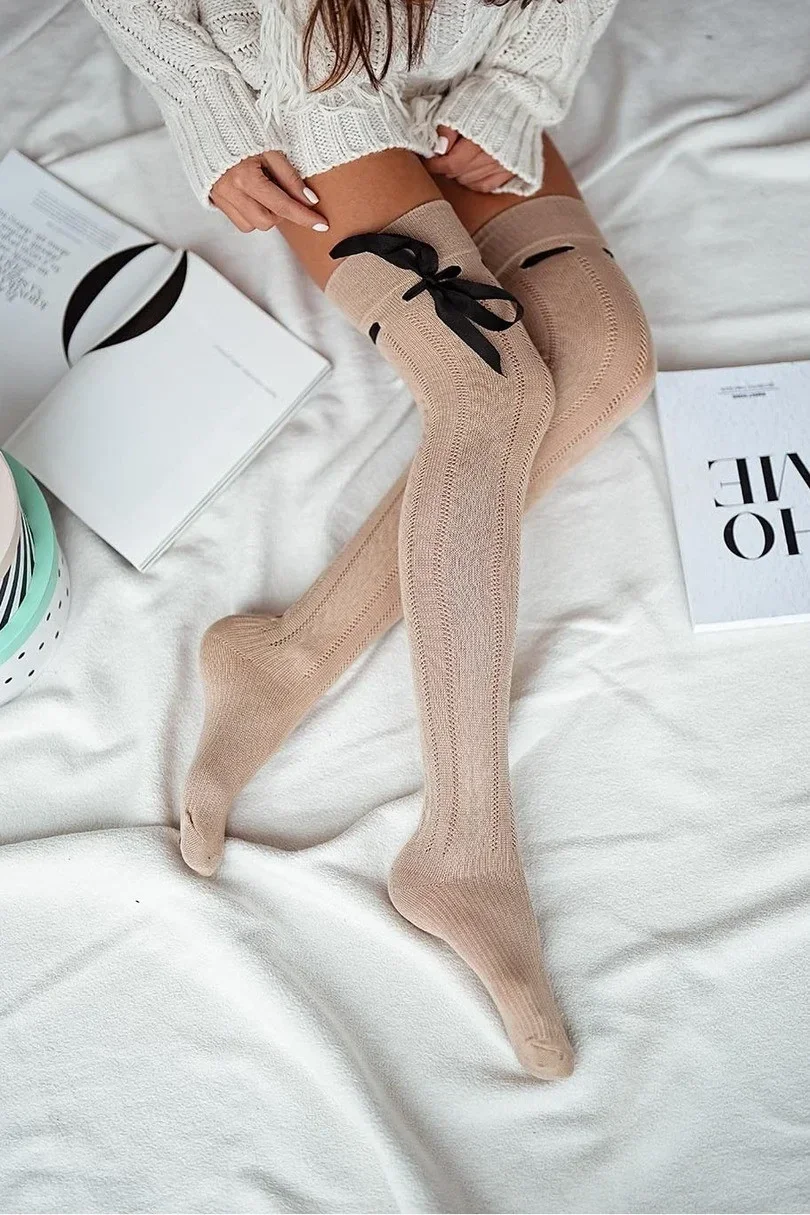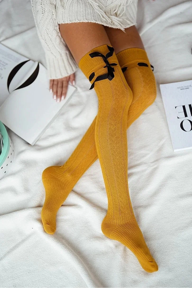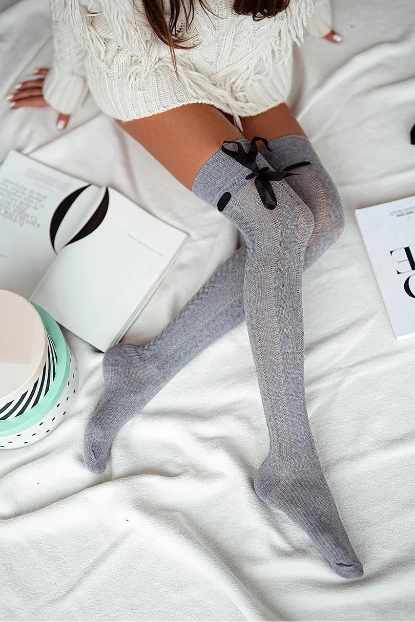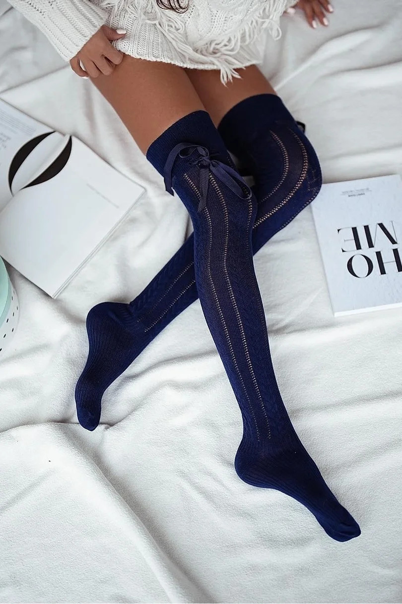 Dámské bavlněné prolamované ponožky pod kolena se stuhou těsně nad kolenem.