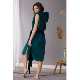 Dámská vesta s kapucí. Vyrobeno z měkkého a sametového plyšového úpletu. Kapsy zdobené jemnou krajkou. Zavazuje se v pase šňůrkou.