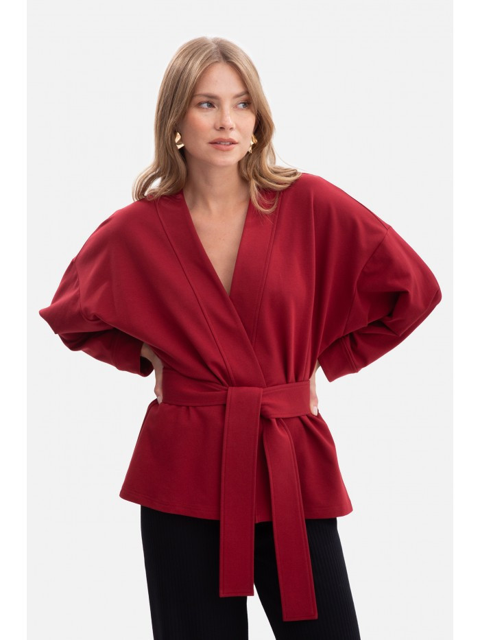 90% bavlna 10% elastan MATERIÁL Materiál: hladký mikinový úplet, spodní strana smyčková, hmotnost 260 g PODROBNOSTI O PRODUKTU Zapínání: otevřené sako, zavazování v pase na poutka na pásek Límec: žádný Kapsy: žádné Rukávy: dlouhé, široké, zakončené manžetami Podšívka: žádná Model: B297 Navrženo a vyrobeno v Polsku z látky vyrobené v Polsku Modelka na fotografii měří 171 cm a má na sobě velikost S/M STYL A STŘIH Střih: volný, otevřený - kimono s páskem Tvar: mírně nadměrný, v pase nastavitelný páskem Délka: do boků