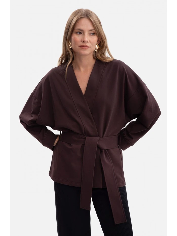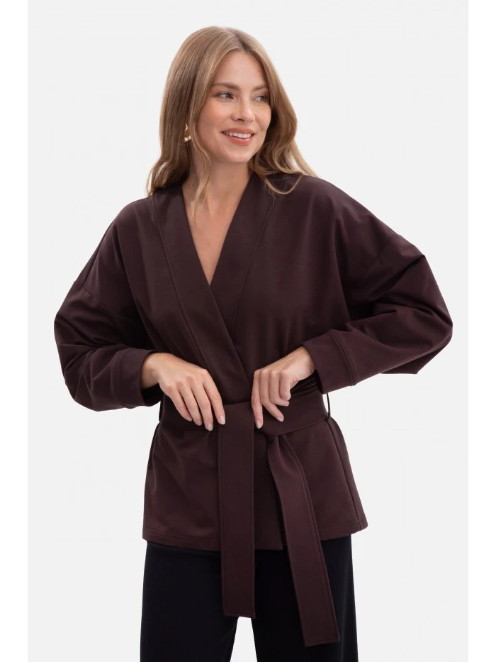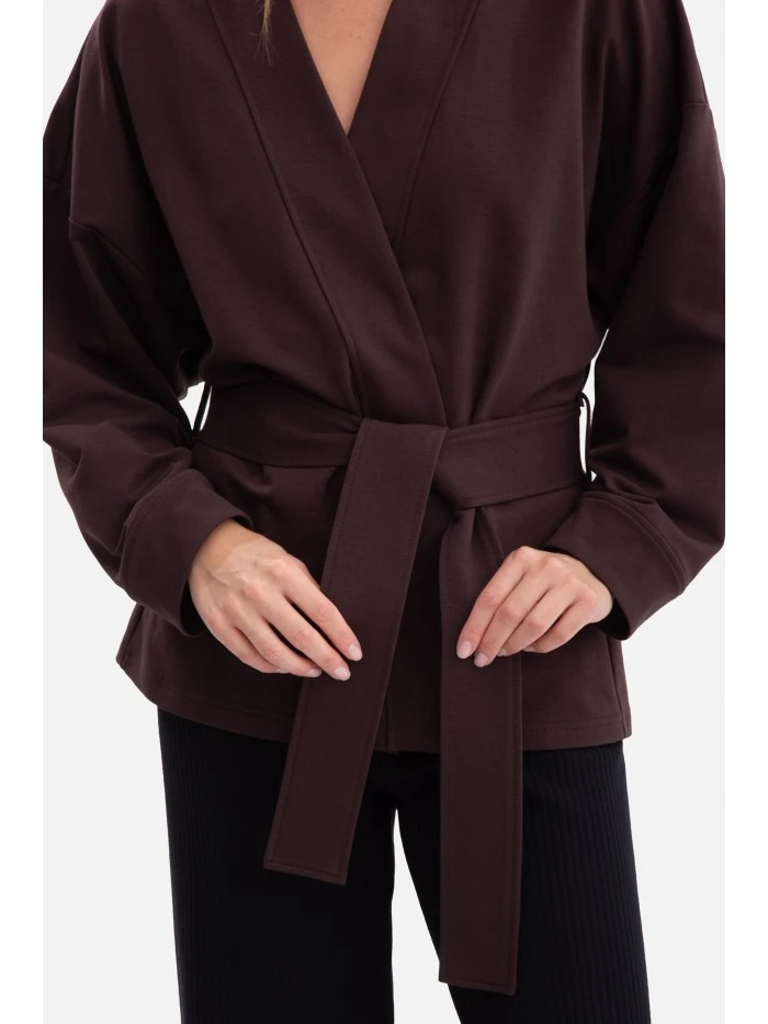 B297 Pletené sako bez límce s otevřenou přední částí - tmavá čokoláda