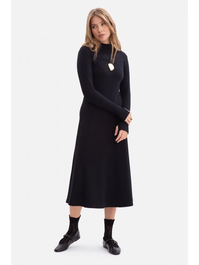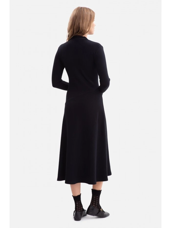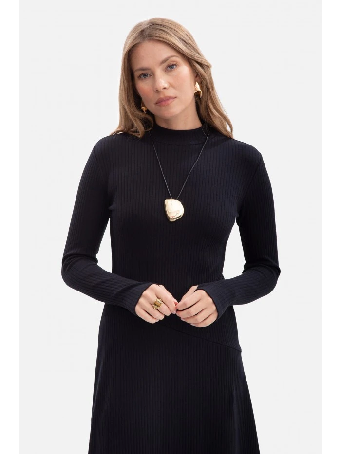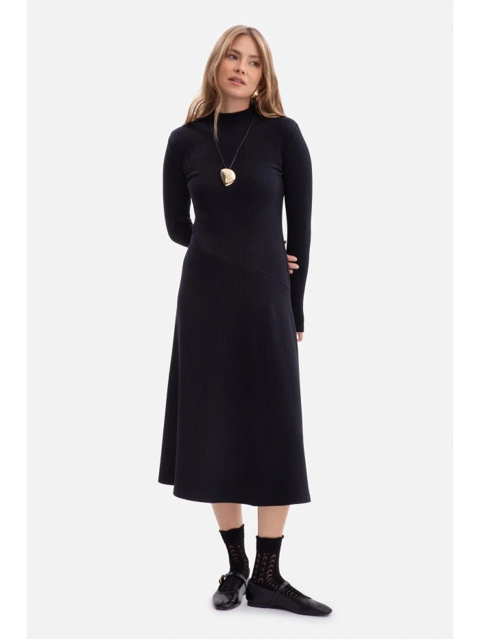 B299 Žebrované midi šaty s asymetrickým pasem - černé