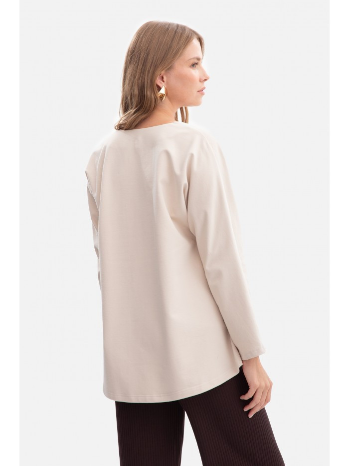 materiál: 90% bavlna 10% elastan Materiál: hladký mikinový úplet, spodní strana smyčková, hmotnost 260 g PODROBNOSTI O PRODUKTU Zapínání: žádné - slip-on styl Límec: žádný, výstřih do V Kapsy: žádné Rukávy: dlouhé, rovné Podšívka: žádná Model: B304 Navrženo a vyrobeno v Polsku z látky vyrobené v Polsku Modelka na fotografii měří 171 cm a má na sobě velikost S/M STYL A STŘIH Střih: volný, oversized Tvar: rovný, mírně rozšířený směrem k lemu Délka: přední díl kratší než zadní díl