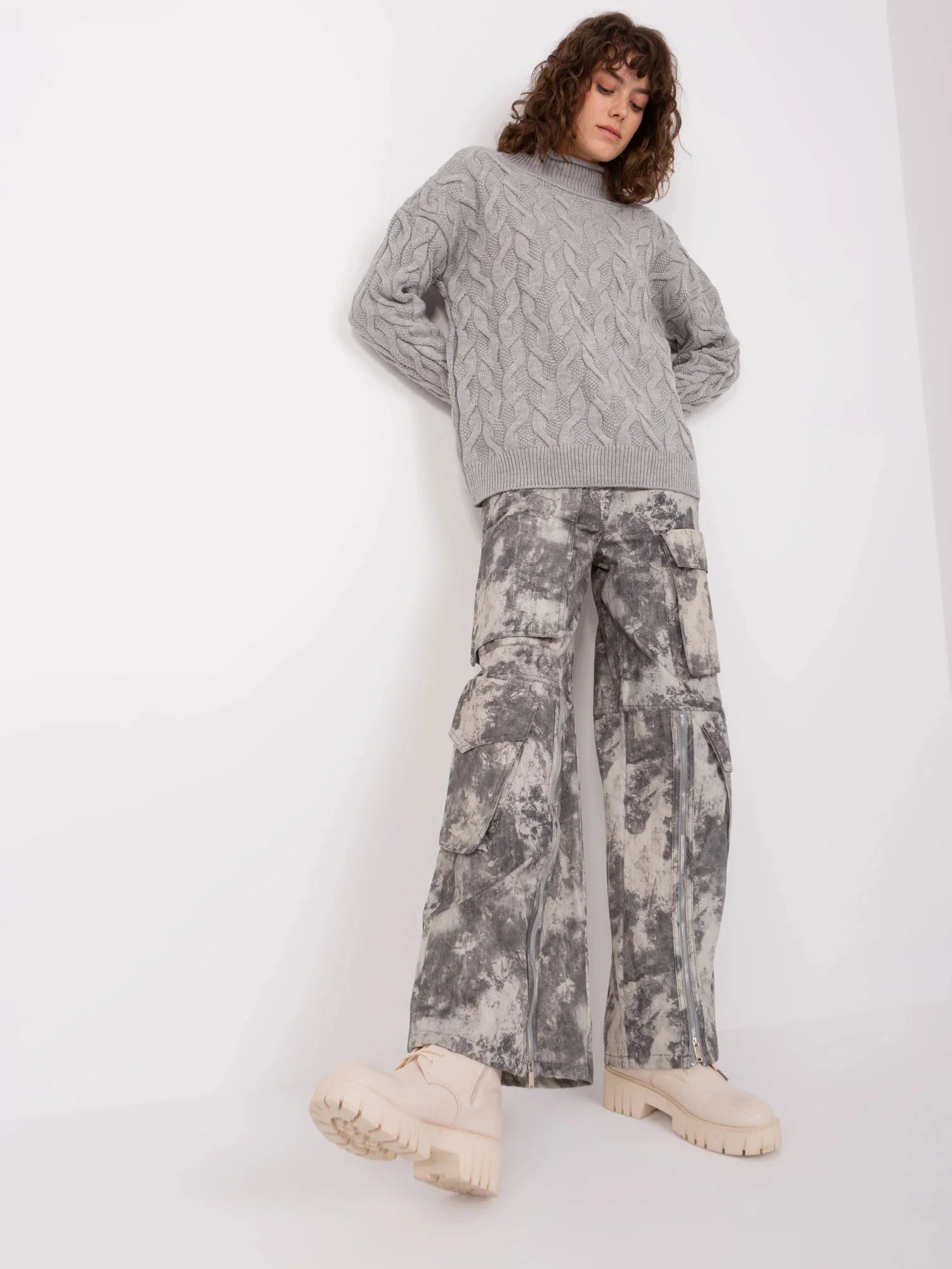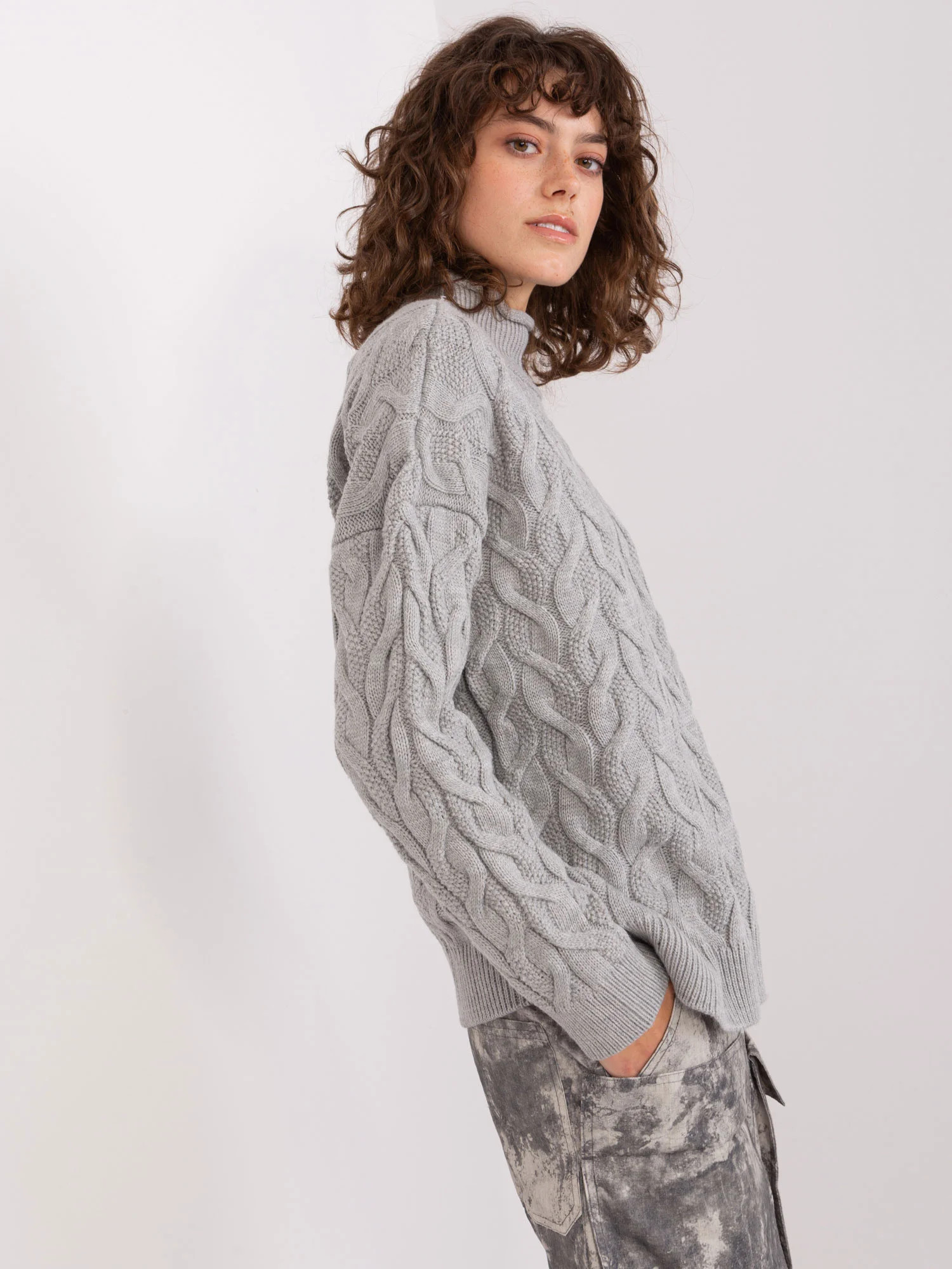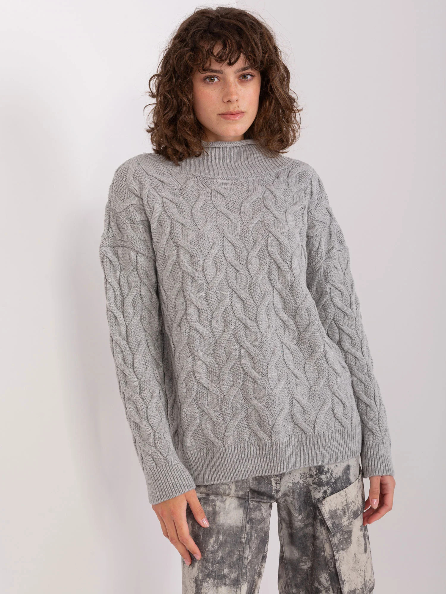 Šedý dámský pletený svetr s kostkami.