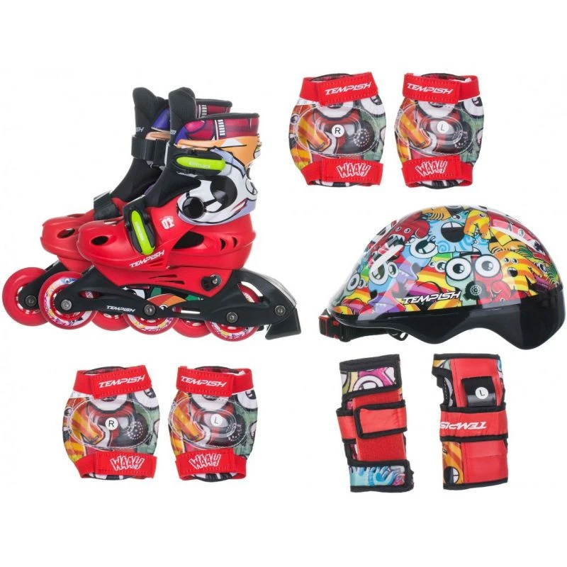 Rolki regulowane TEMPISH Baby Skate '17 Wspaniały zestaw dedykowany dla młodszych rolkarzy. Zestaw posiada wszystkie niezbędne elementy potrzebne do bezpiecznej i komfortowej jazdy – rolki, kask oraz ochraniacze na łokcie, nadgarstki i kolana. Wszystkie elementy zostały wykonane z wytrzymałych materiałów, gwarantując tym samym odpowiednio długą żywotność Zestaw składa się z: Rolki – 1 para Ochraniacze łokci – 2 sztuki Ochraniacze kolan – 2 sztuki Ochraniacze nadgarstków – 2 sztuki Skorupa z tworzywa Miękka wyściółka Anatomiczne dopasowanie Zapięcie: 2 elastyczne paski na rzep Kask dziecięcy – 1 sztuka Materiał zewnętrzny: PVC Materiał wewnętrzny: EPS Waga: 170-190 g (rozm. S) 6 otworów wentylacyjnych Zapięcie: regulowany pasek z klamrą Miękkie elementy wyściółki przypinane na rzep Plecak Wymiary: 37 x 34 x 16 cm (szer. x wys. x gr.) Komora główna zamykana jednokierunkowym zamkiem 2 kieszonki boczne zamykane na zamek Regulowane szelki Uchwyt do noszenia w dłoni