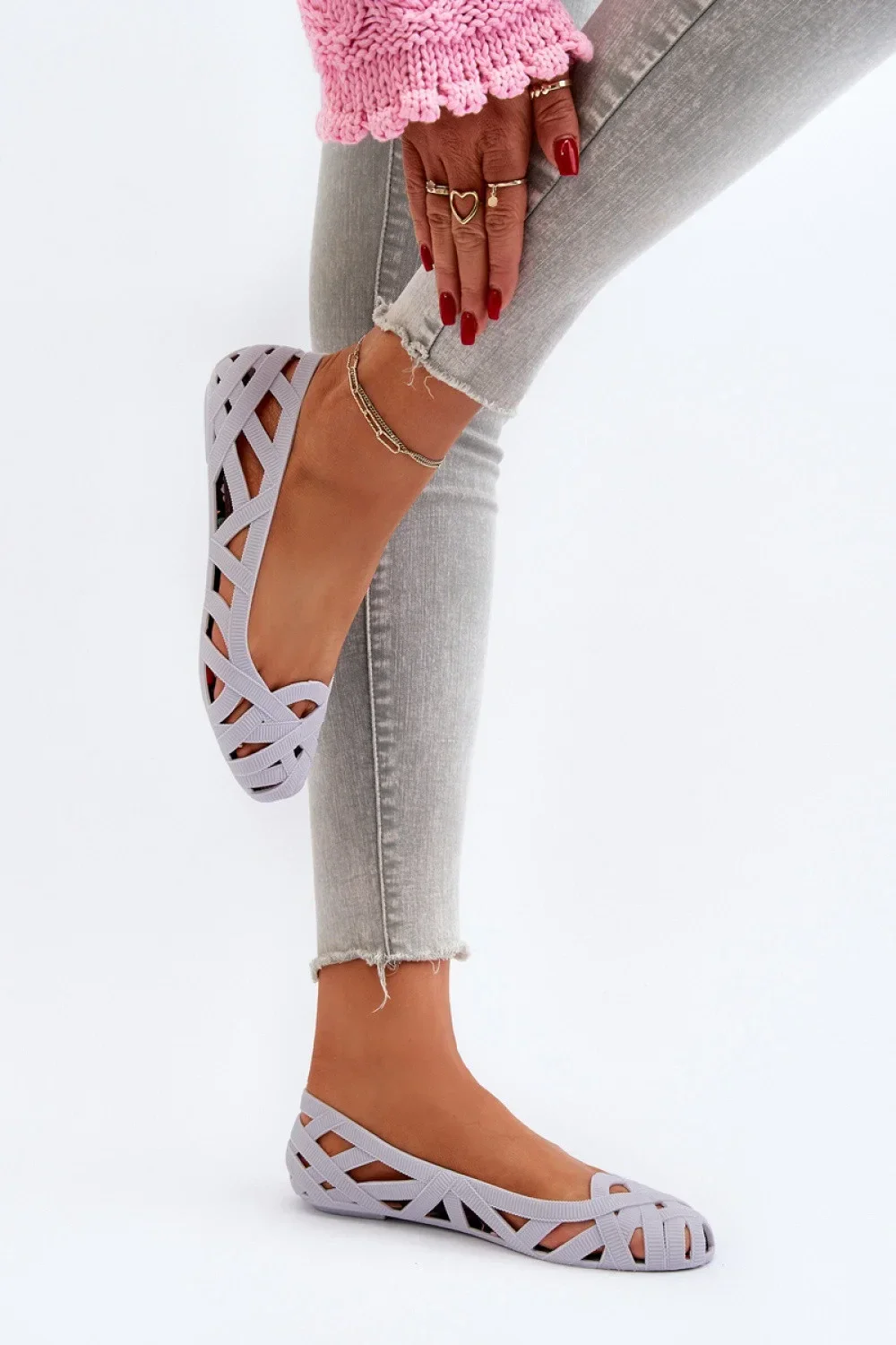 Dámské baleríny jsou vyrobeny z gumového materiálu. Ozdobný střih s proplétajícími se pásky. Baleríny jsou usazeny na plochém podpatku. Nos ve tvaru mandle. Tento model je ideální pro horké dny!