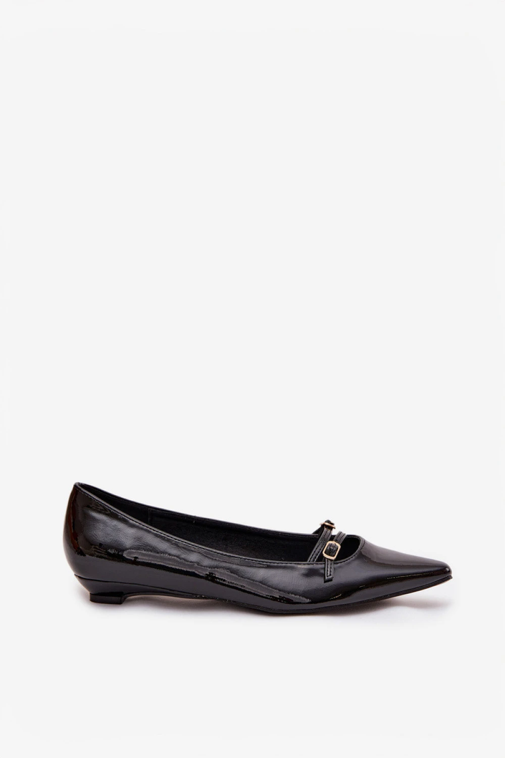Baleríny vyrobené z lakované ekokože. Model umístěný na jemném podpatku poskytuje jemné zdvihnutí a pohodlí během nošení. Vepředu zdobí dva tenké řemínky se zlatými sponami, které dodávají celku výjimečný, elegantní charakter. Špičatý nos opticky zjemňuje nohy, zdůrazňující jejich jemný tvar. Tyto baleríny se skvěle hodí jak k elegantním kancelářským stylizacím, tak i během večerních výletů, kdy chcete vypadat stylově a cítit se pohodlně po celý den.