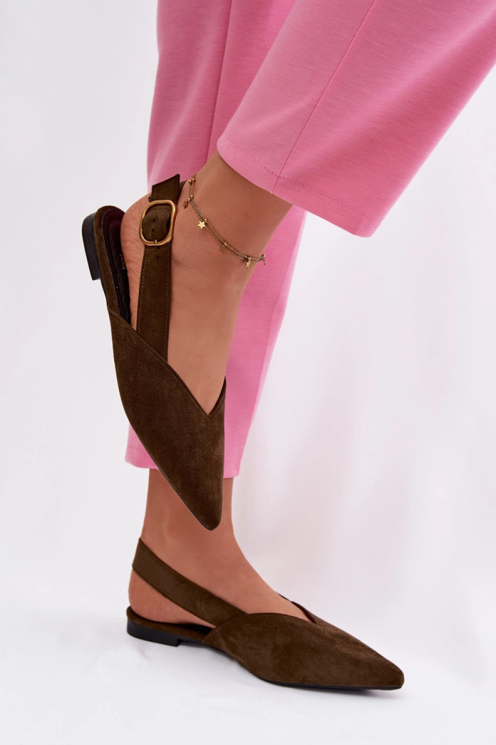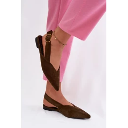 Elegantní a pohodlné dámské baleríny z ekosuede jsou stylovou nabídkou na každý den i na speciální příležitosti. Špičatý návlek jim dodává moderní charakter a opticky prodlužuje nohu. Nastavitelný popruh se zlatou přezkou umožňuje dokonale přizpůsobit boty noze, zároveň představují elegantní detail. Tento model skvěle doplní jak každodenní, tak elegantní stylizace.