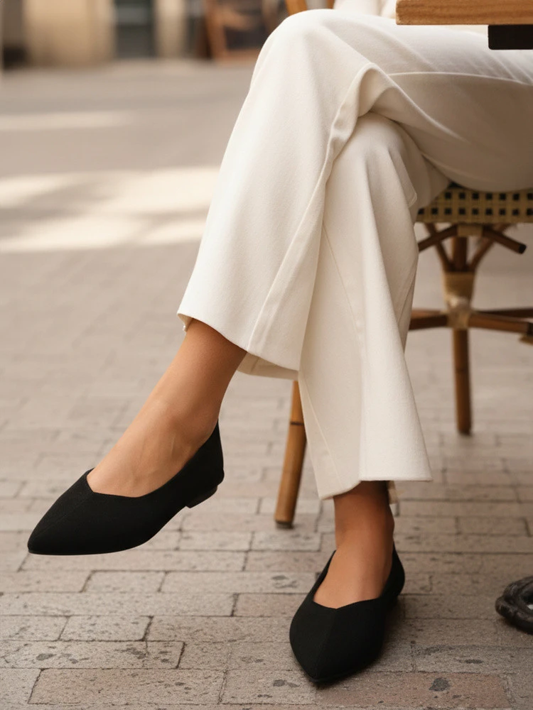 Eleganckie baleriny damskie o minimalistycznym fasonie z subtelnie wydłużonym noskiem w szpic. Smukła linia optycznie wysmukla stopę i nadaje stylizacji lekkości. Płaska podeszwa zapewnia komfort podczas codziennego użytkowania. Model sprawdzi się zarówno w stylizacjach casualowych, jak i bardziej formalnych zestawieniach.