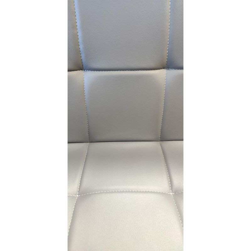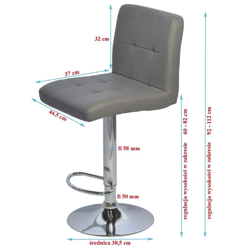 Krzesło wykonano z bardzo wytrzymałych materiałów. Stabilna, chromowana noga z podstawą (chromowaną) daje Ci bezpieczeństwo podczas siedzenia. Za pomocą specjalnego mechanizmu, w łatwy sposób wyregulujesz wysokość pomiędzy: 92-112 cm. Szerokie, idealnie wyprofilowane siedzisko jest w pełni obrotowe. To umożliwia sięganie rękoma po przedmioty bez potrzeby wstawania. Ponadto siedzisko stanowi doskonałe podparcie dla kręgosłupa. Chromowany stelaż posiada ergonomiczną podpórkę na nogi, która podnosi komfort siedzenia, oraz pomaga utrzymywać równowagę.