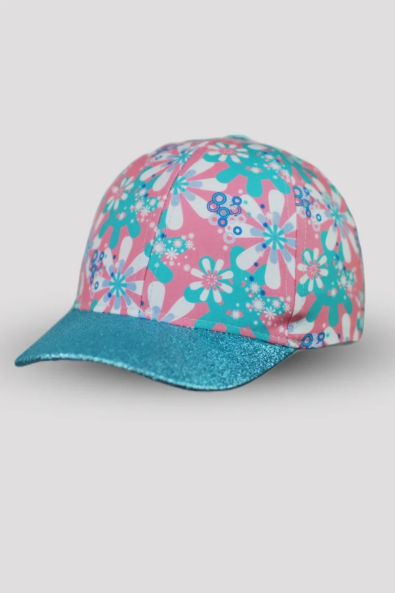 Dívčí klobouk s květinovým potiskem a třpytivým, třpytivým kšiltem. Složení: 100% bavlna
