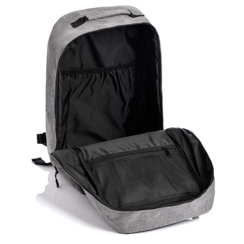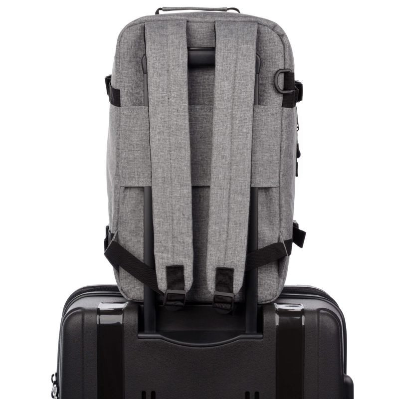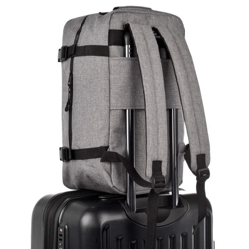 - Hlavní přihrádka a tři menší kapsy, včetně jedné síťované, nabízejí chytré uspořádání prostoru pro nezbytné věci a drobnosti. Další vnější kapsa na zip je ideální pro doklady, telefon nebo tablet. Pohodlný pohyb se zavazadlem usnadňuje speciálně navržené madlo pro připevnění batohu k rukojeti kufru.