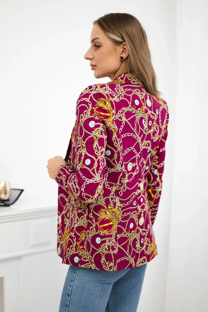 Bavlněné sako s potištěným knoflíkem je stylovým prvkem šatníku, který kombinuje klasický styl s nádechem moderny. Vyrobeno z vysoce kvalitní bavlny, zajišťuje pohodlí při nošení, ideální na celý den. Jedinečný potisk mu dodává osobitý charakter a odlišuje se od klasických modelů. Zapínání na knoflíky podtrhuje elegantní střih a dobře ušitý střih perfektně sedí na postavě a podtrhuje její přednosti. Je to všestranná volba pro různé příležitosti – od příležitostných schůzek až po poloformální události. Skvěle se hodí jak k rovným kalhotám, tak k džínám a dodává celému looku módní akcent. Ideální pro lidi, kteří oceňují pohodlí a jedinečný styl.. Sako má podšívku. Sako je k dispozici ve velikostech M, L, XL.