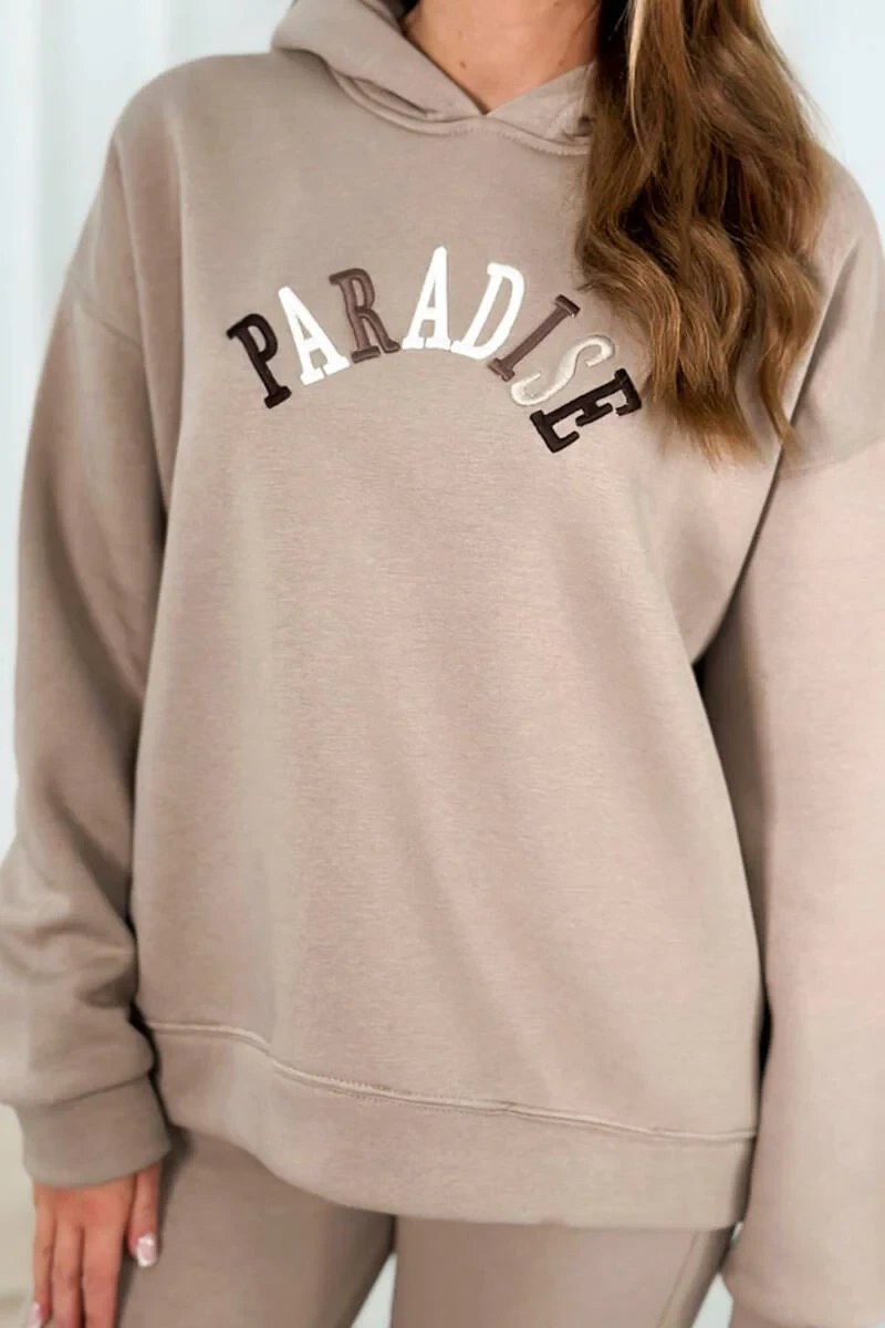 Bavlněná souprava s vyšívaným nápisem Paradise tmavě béžová