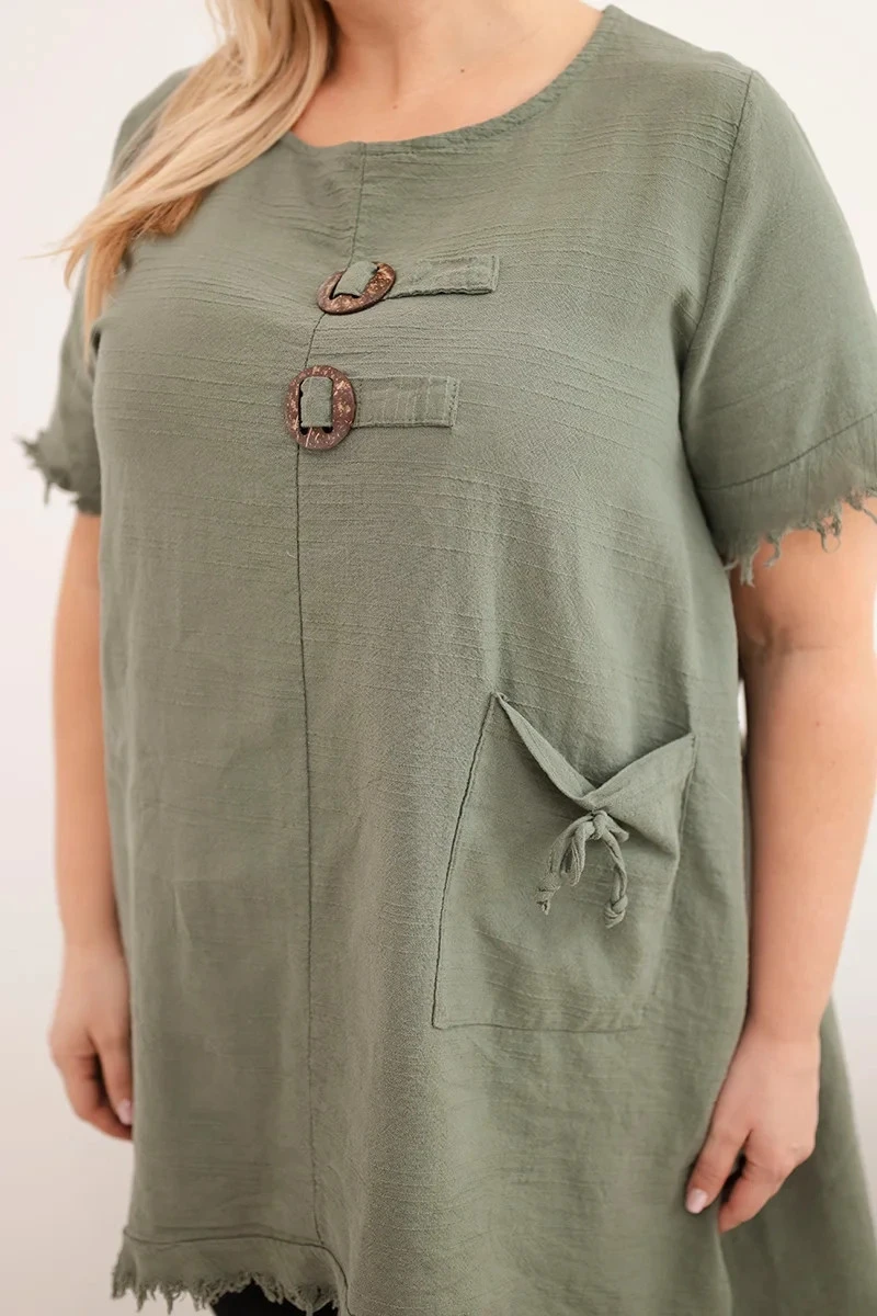 • Bavlněné dámské šaty Plus Size s prodlouženým zadním dílem a kapsou khaki