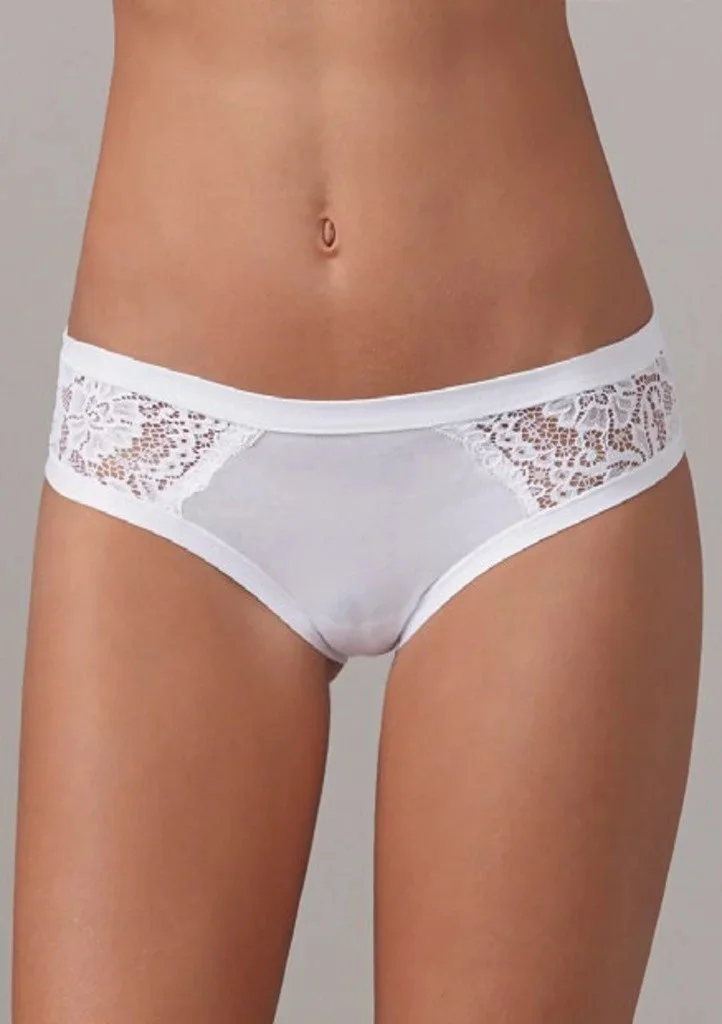 Bavlněné dámské kalhotky klasického střihu. Jsou velice příjemné na nošení a jsou vyroben s jemné bavlny. Přední díl je po stranách doplněn všitou krajkou. Materiálové složení: 90% CO, 10% EL