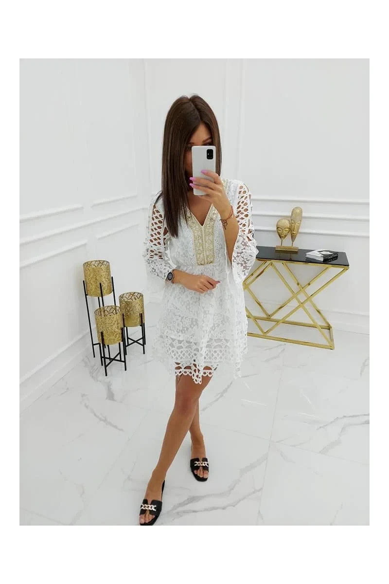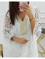 Bavlněné šaty v nejmódnějším boho stylu této sezóny, ve skutečně ženském vydání, lákajícím na zajímavou kombinaci krajky a gipuru. Velmi pohodlné, na jemné podšívce, příjemné na nošení. Výstřih do V s lehce lesklou úpravou, projmuté rukávy. V pase jemná gumička, díky níž šaty pěkně sedí prakticky na každé postavě. Složení: 100% bavlna.