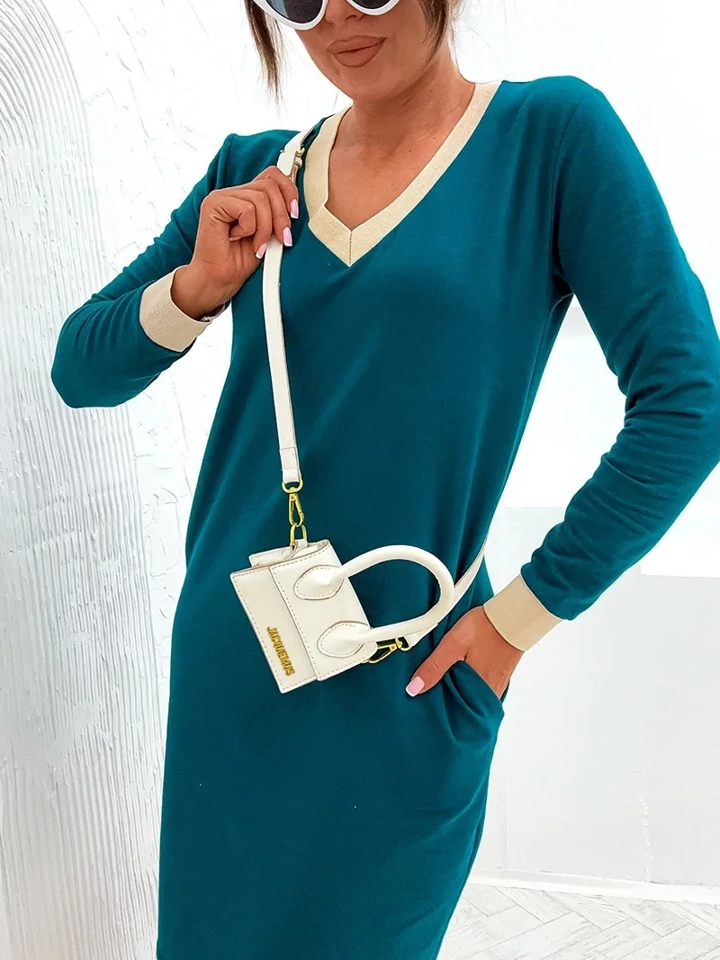 Šaty mají výstřih ve tvaru písmene "V" a délku mini. Dlouhé rukávy jsou olemované stahovacími lemy.