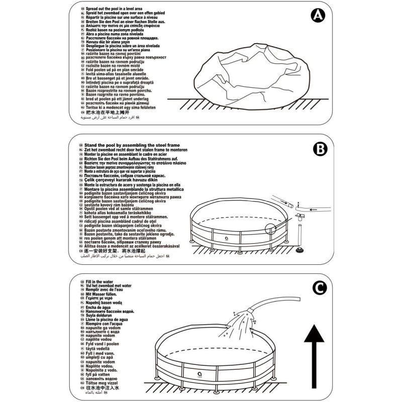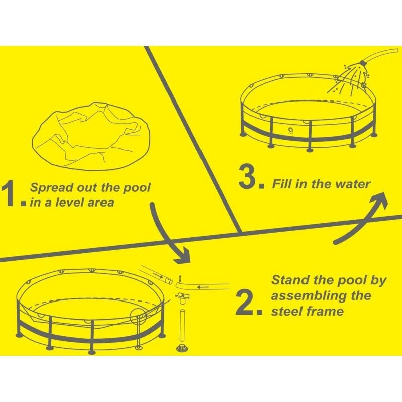 Sestavení bazénu je velmi snadné a nevyžaduje žádné odborné nářadí. Ocelový rám a sloupky se rychle spojí a vytvoří stabilní konstrukci, která zajistí bezpečnost a pohodlí. Připraven k napuštění vodou během okamžiku!