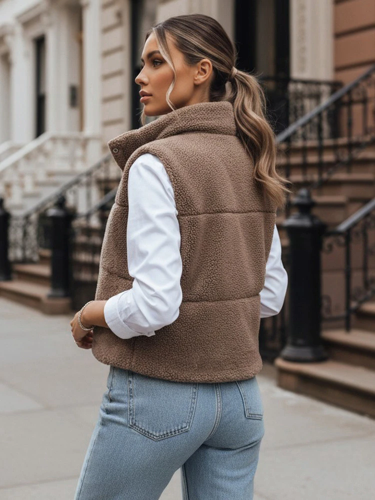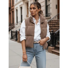 Vesta z ovčí kůže s měkkou texturou doplňuje styling v chladném počasí a poskytuje příjemný pocit zavinutí. Rovný střih umožňuje snadnou kombinaci s košilemi, halenkami a lehkými svetry. Vysoký límec upravuje postavu a chrání krk před chladem. Model je ideální pro každodenní městské outfity.