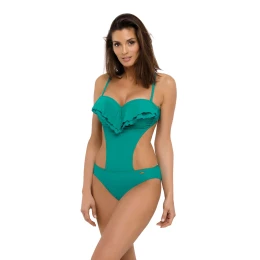 Jednodílné plavky monokinového střihu s vykrojenými boky působí moderně. Horní díl plavek tvoří sexy push-up a pečlivě tvarované košíčky, vyztužené speciální pěnou, s trvale zabudovanou a neodnímatelnou push-up výplní (push-up je součástí každé velikosti plavek). Střih pozvedá a zvětšuje prsa a vytváří sexy dekolt, který zdobí vzdušný volánek. A to není všechno. Plavky jsou vyrobeny z italské elastické tkaniny, jsou hladké, pohodlné, zavazují se na zádech a mají plně odnímatelná ramínka. Šťavnaté barvy na výběr až v tuctu variant - vyberte si ji ve své oblíbené barvě. Složení: 80 % polyamid, 20 % elastan.