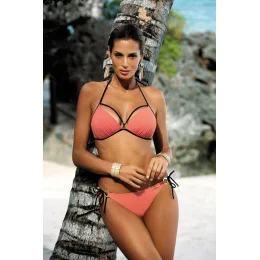 Hladké dvoudílné plavky jsou ušité z italské látky, s ramínky ve výstřihu, ve skvělých barvách, svůdné a ženské. Podprsenka je zespodu vyplněná speciální pěnou a obohacená o push-up výplň (neodnímatelnou) - shrnuje prsa do výstřihu, nadzvedává je a opticky zvětšuje. Uprostřed je brož. Podprsenka se zavazuje na zádech i za krkem. Kalhotky se také zavazují na obou stranách, jsou velmi pohodlné. Vynikají krásnými bižuterními kroužky po stranách. Velmi půvabně zdobí boky.