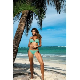 Hladké dvoudílné plavky jsou ušité z italské látky, s ramínky ve výstřihu, ve skvělých barvách, svůdné a ženské. Podprsenka je zespodu vyplněná speciální pěnou a obohacená o push-up výplň (neodnímatelnou) - shrnuje prsa do výstřihu, nadzvedává je a opticky zvětšuje. Uprostřed je brož. Podprsenka se zavazuje na zádech i za krkem. Kalhotky se také zavazují na obou stranách, jsou velmi pohodlné. Vynikají krásnými bižuterními kroužky po stranách. Velmi půvabně zdobí boky.