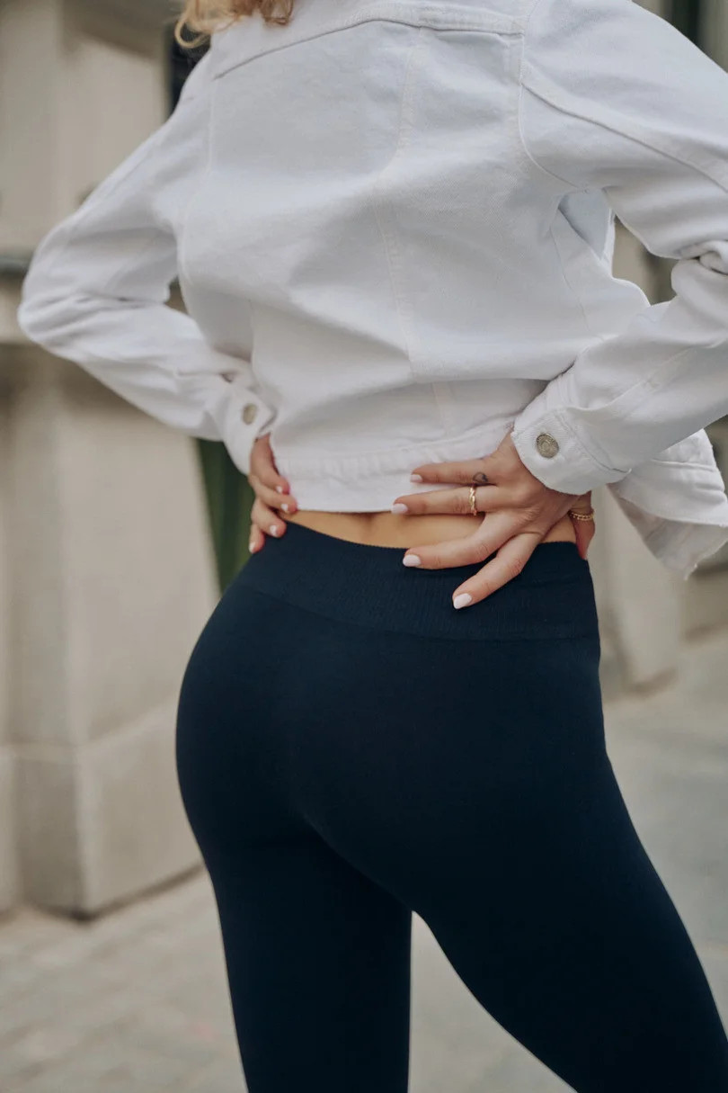 Černé neprůhledné legíny s vysokým pasem obepínají pas a zplošťují a podpírají břicho.