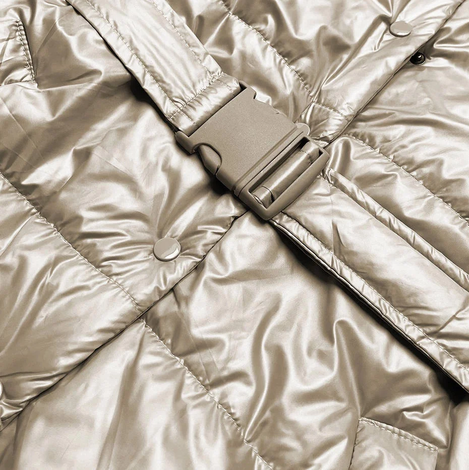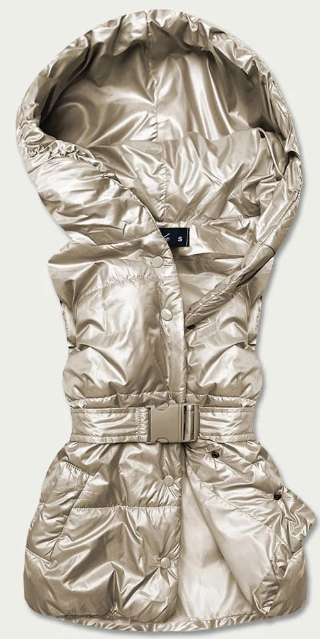Vesta je lehce zateplená syntetickou péřovou výplní, má jednoduchý střih, dvě kapsy a zapíná se patentkami. Model má kapuci, kterou není možné odepnout. V pase je opasek. Model má délku k bokům.