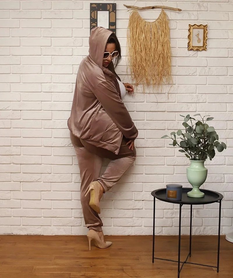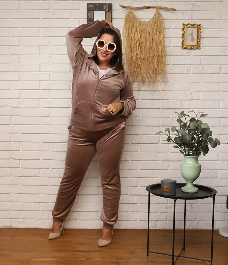 Přidání recenze k Béžová dámská plus size tepláková souprava s rozepínací mikinou (8216)