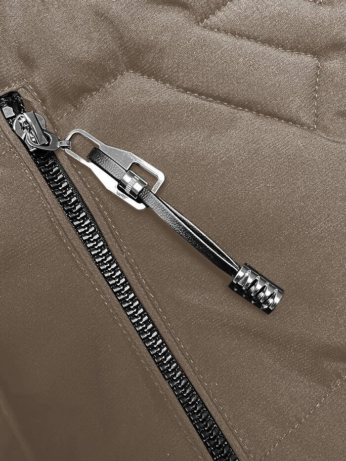 Vesta je zateplená syntetickou péřovou výplní, má dvě kapsy a zapíná se dvousměrným zipem. Model má kapuci, kterou je možné odepnout. Vesta má délku do poloviny stehen.