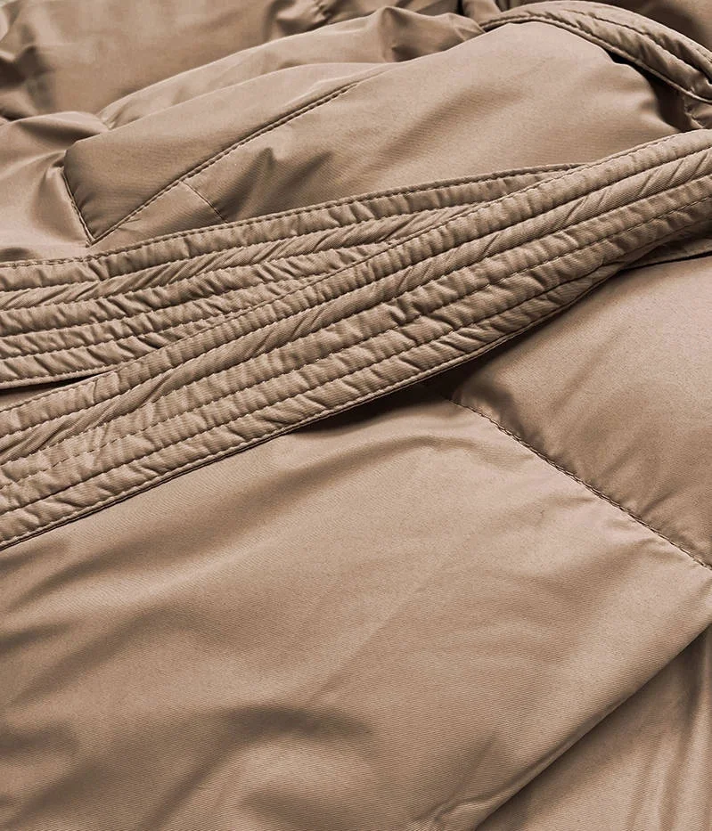 Bunda má jednoduchý střih, je zateplená syntetickou péřovou výplní, má pásek pro zavazování, dvě kapsy a zapíná se patentkami. Model má délku ke kolenům.