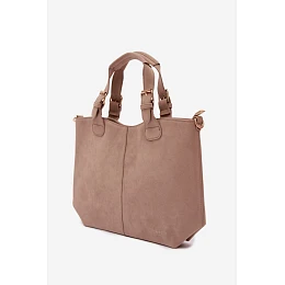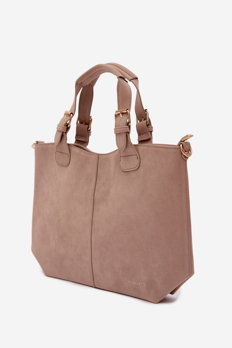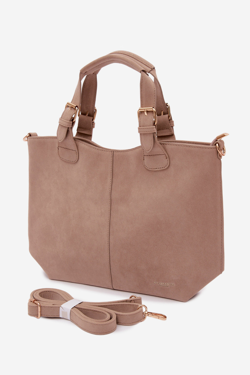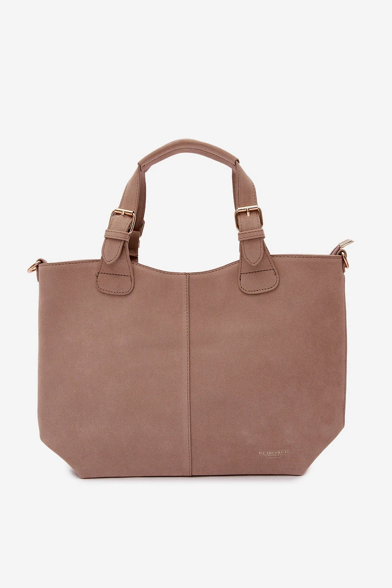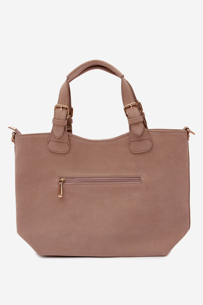 Klasická dámská kabelka vyrobená z imitace semiše je elegantní a univerzální doplněk, který se skvěle hodí jak na každodenní nošení, tak na formálnější příležitosti. Model je zapínán na zip, což zajišťuje bezpečí uložených věcí. Vnitřek kabelky je rozdělen na dvě přihrádky a vybaven praktickými kapsami, které usnadňují organizaci a pomáhají udržet pořádek. Kabelka má pohodlné držadla na nošení v ruce a odnímatelný pásek, díky kterému ji lze nosit i na rameni nebo přes rameno – podle potřeby. Šířka - 39 cm Výška - 25 cm Tloušťka - 11 cm