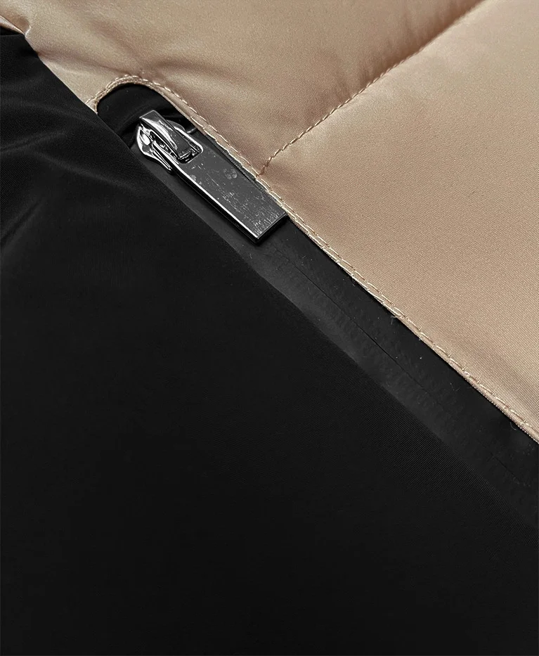 Bunda je zateplená syntetickou péřovou výplní, má dvě kapsy a zapíná se pogumovaným zipem. Model má kapuci olemovanou kožešinou. Kapuci i kožešinu je možné odepnout. Na koncích rukávů jsou skryté stahovací lemy. Na bocích jsou v pase stahovací pásky. Bunda má délku k bokům.