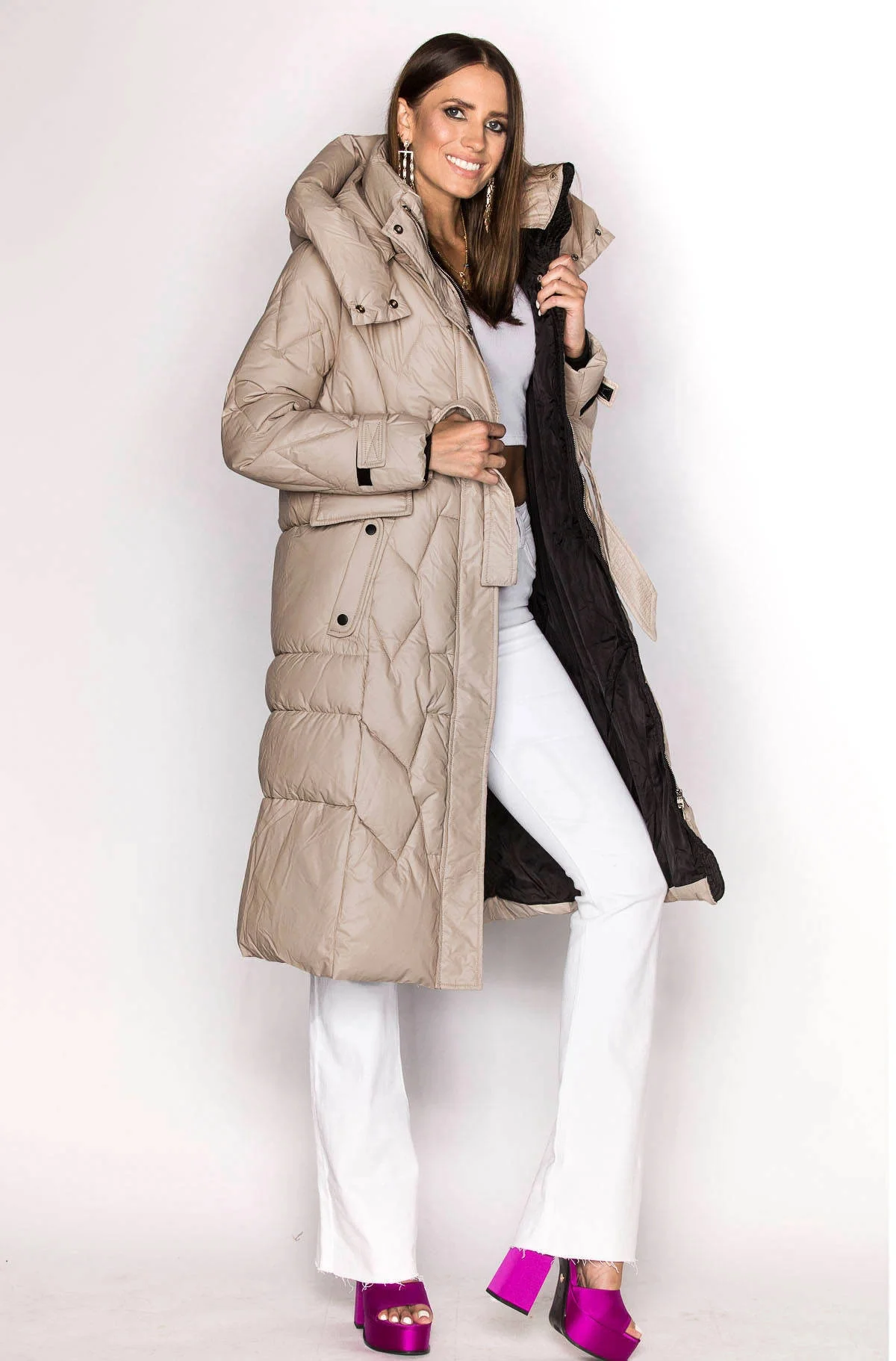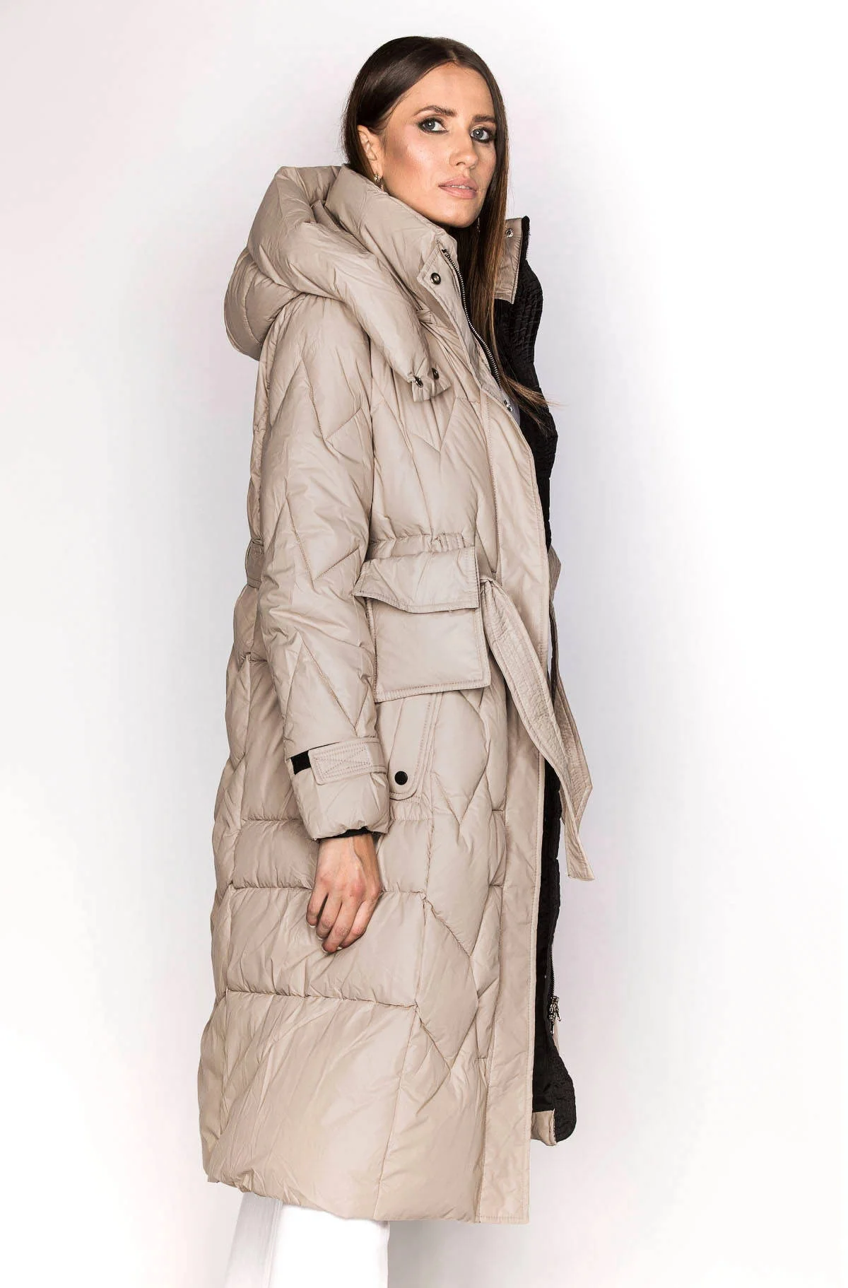 Bunda má volný střih, je zateplená syntetickou péřovou výplní, má dvě kapsy a zapíná se dvousměrným zipem a panelem s patentkami. Model má stojáček a má také pásek pro zavazování s kapsičkou. Rukávy jsou olemované skrytými stahovacími lemy. Bunda má délku ke kolenům.